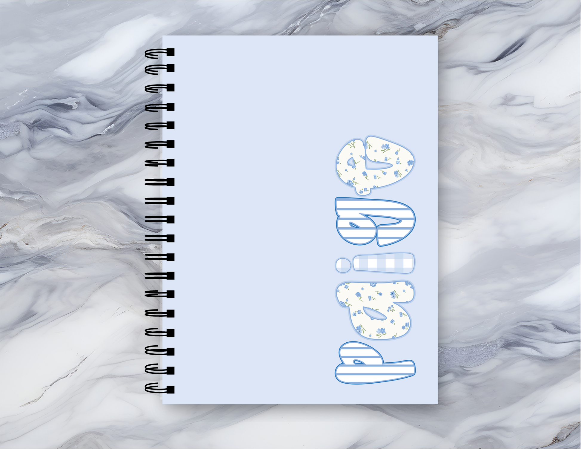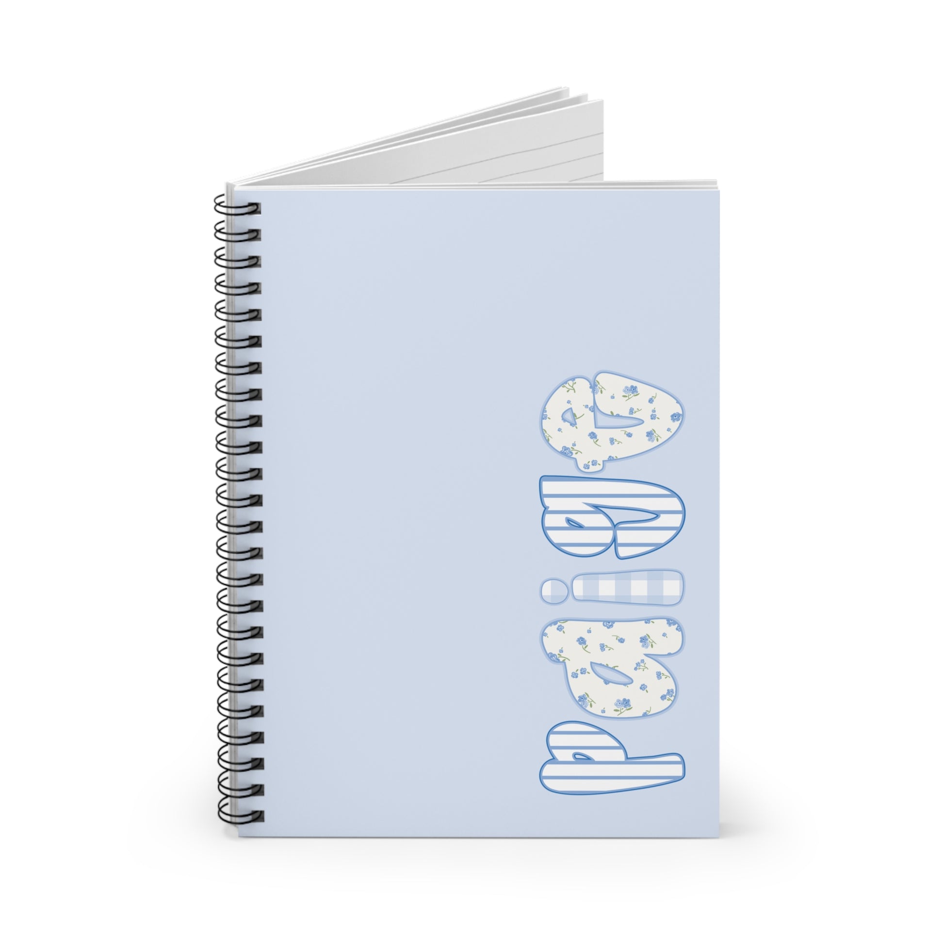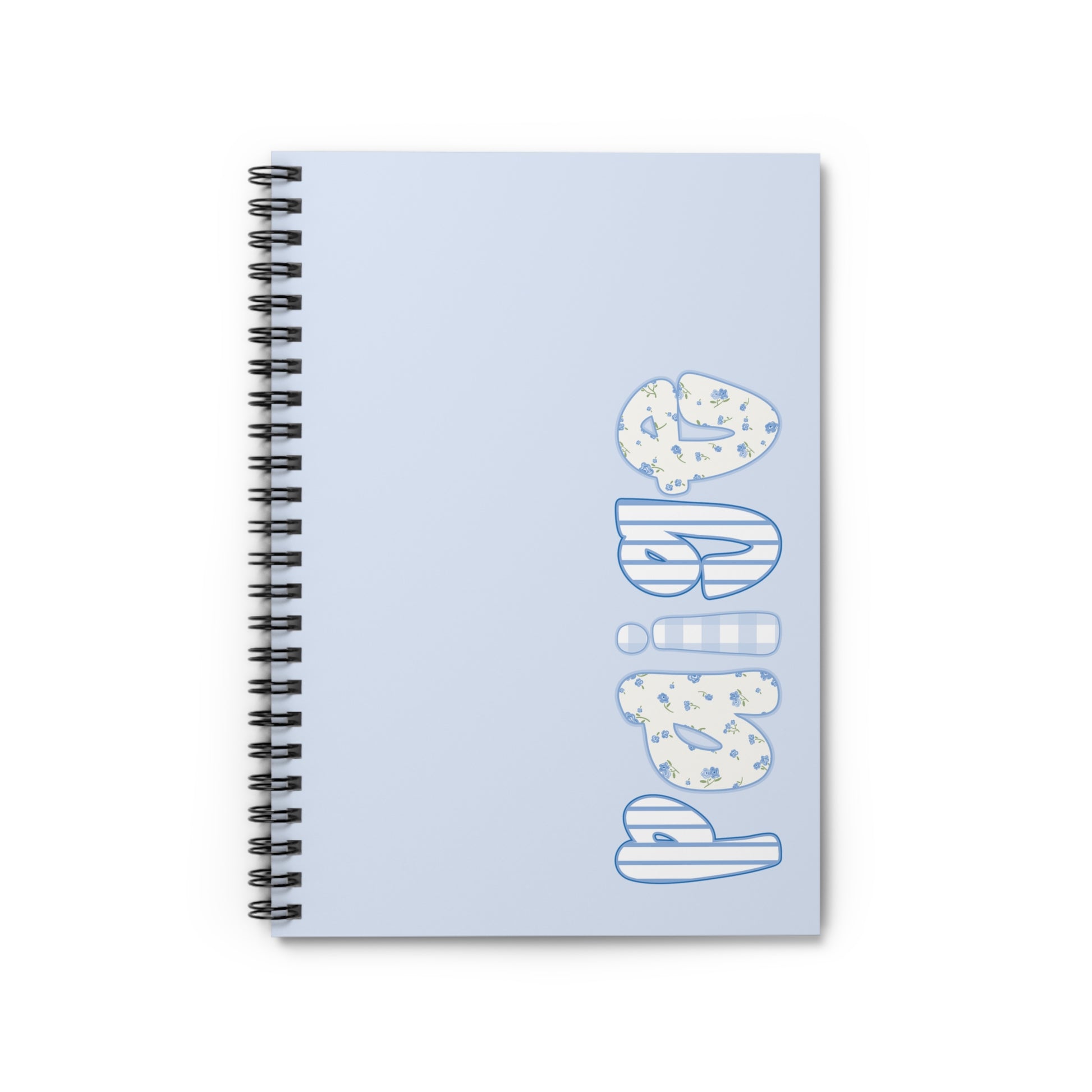 A soft, sky-blue spiral notebook made for thoughtful note-takers and doodlers. The front cover features playful, bubble-letter artwork stacked vertically—each letter patterned with subtle cream speckles and outlined in a gentle blue—that gives the book a cheerful, creative vibe. At 6 x 8 inches this ruled notebook slips into bags and backpacks without weighing you down. Inside are 118 lined pages on smooth 90gsm paper that welcome everyday writing, lists, and ideas. A metal spiral spine lets pages lie flat for comfortable writing and makes tearing out a sheet clean and simple. The inside back cover hides a slim document pocket for loose receipts, ticket stubs, or notes. Durable 350gsm covers keep the notebook feeling sturdy while the dark grey back adds a grounded contrast to the airy front art.