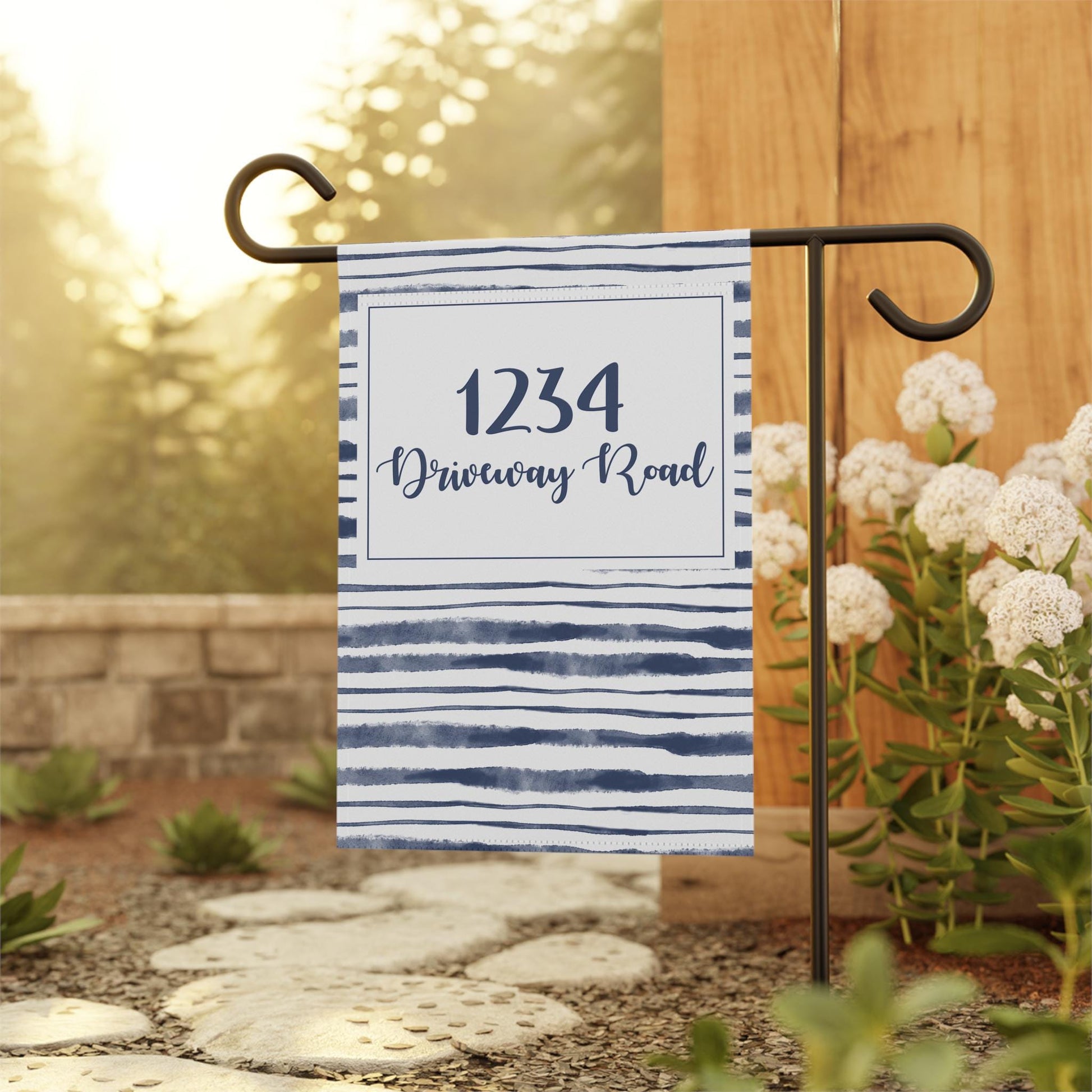 Bring timeless coastal style to your home with this personalized navy striped house number garden flag. Featuring watercolor-style navy stripes and elegant script, this custom address flag adds a polished nautical touch to your yard, porch, or garden.