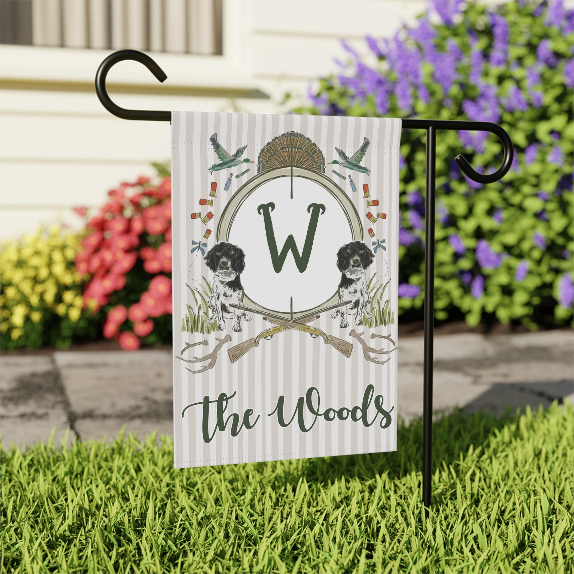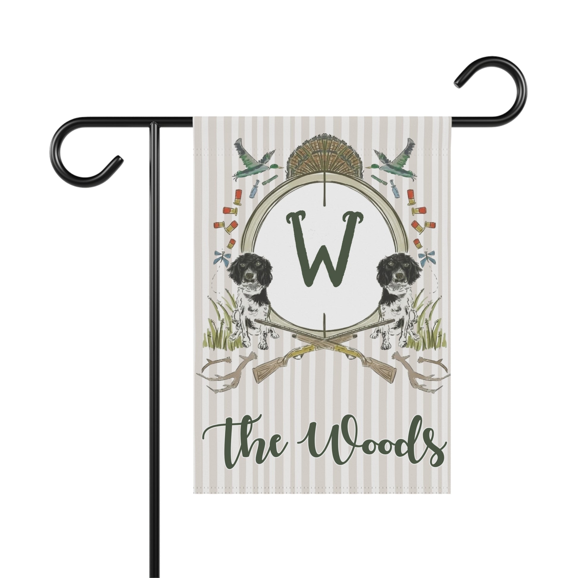 A welcoming garden and house banner that brings gentle countryside charm to your porch or yard. Soft neutral stripes form the backdrop for hand-drawn woodland motifs: a seasonal wreath topped with wheat, crossed vintage oars, playful spaniel silhouettes, and small songbirds in flight. The single initial in the center and handwritten family name beneath give it a custom, homey feel — like a personal crest for slow mornings and backyard gatherings. Lightweight and durable, it hangs neatly from a standard garden pole and reads both near and far without overpowering the landscape.