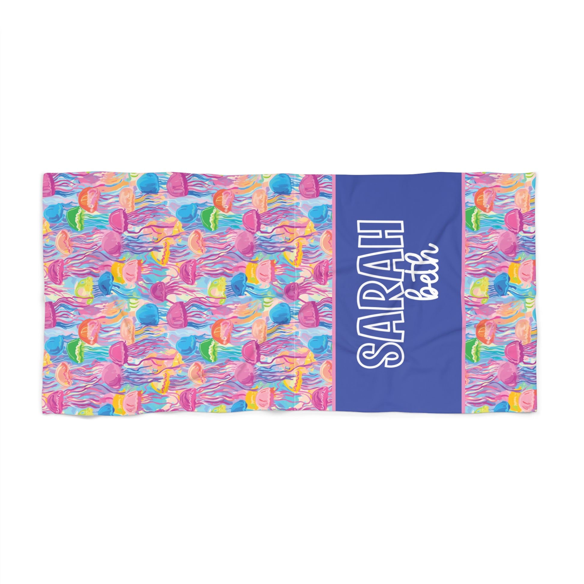 Bright, playful, and totally unique—this Personalized Jellyfish Beach Towel is covered in colorful underwater jellyfish and finished with a bold custom name band. It’s perfect for kids and tweens who love fun ocean vibes—and it’s easy to spot at the pool, beach, or summer camp.Perfect forBeach trips, pool days, lake weekends, cruisesSwim lessons, swim team, water parksSummer camp & sleepaway camp (no more towel mix-ups!)Birthday gifts, vacation essentials, sibling setsDesign detailsVibrant jellyfish + underwater sea life pattern in pinks, purples, blues, greens, and coral tonesPersonalized name band with first name + optional second lineBold, high-visibility design that stands out on the sandHow to orderSelect your size/options from the dropdown.Enter personalization exactly as you want it printed.Checkout—your towel is made to order.Please noteI print exactly what you type—please double-check spelling and capitalization.Colors may vary slightly due to screen settings and printing.Want a different band color or ocean theme (sharks, turtles, dolphins, mermaids)? Message me—I can usually customize it.Product features- 52% polyester / 48% cotton (US) or 50/50 (EU) blend — durable, colorfast print surface- White cotton loop backing for softness and absorbency- Hemmed edges for long-lasting durability- Two sizes: 30"×60" and 36"×72"- One-sided print — quick-drying polyester faceCare instructions- Wash the item only cold machine wash with similar colors garments using a gentle cycle. Tumble dry on low settings or hang dry. Do not bleach or dry clean.