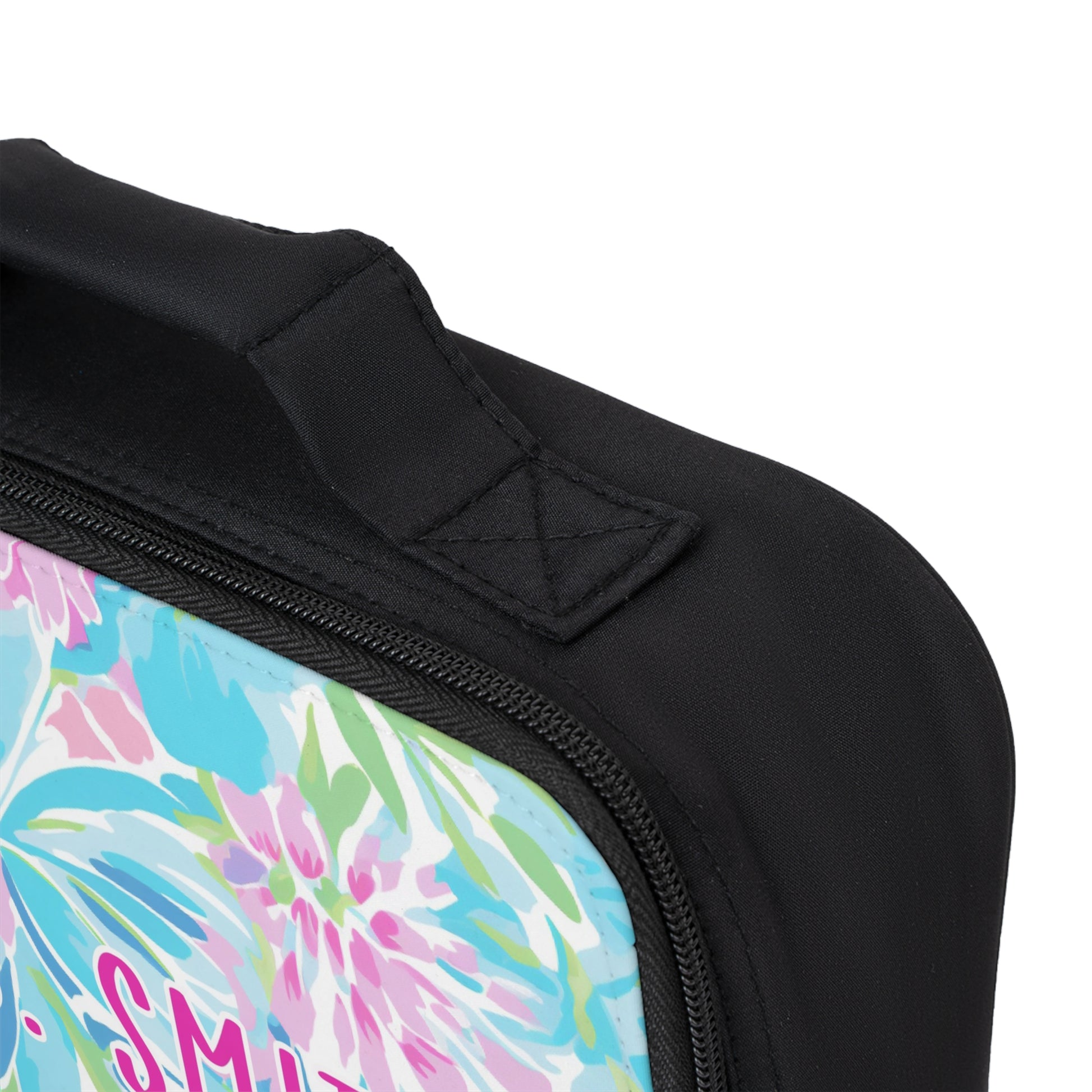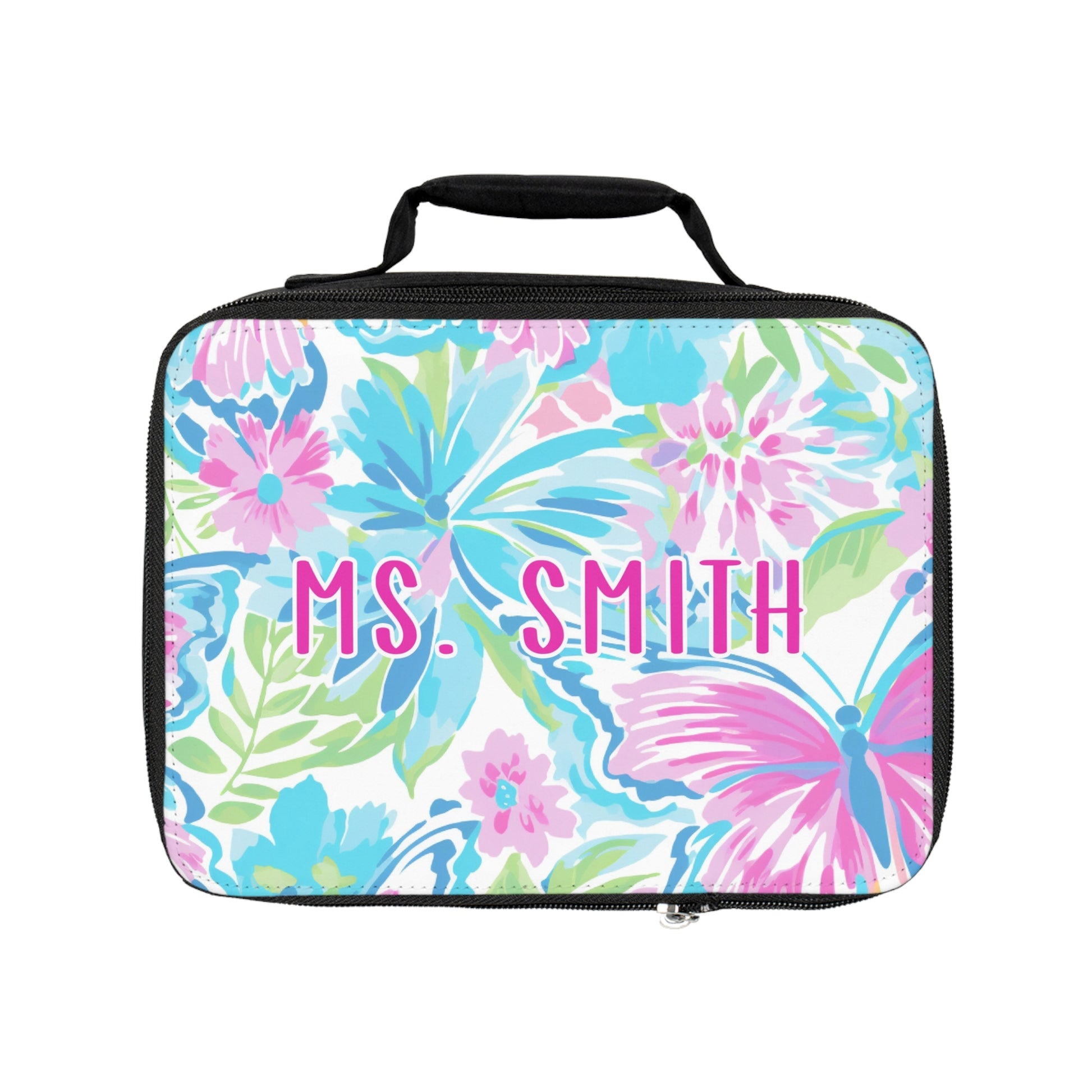 Make lunch stylish and personal with this customized floral butterfly lunch box! Featuring a vibrant, Lilly-inspired design in pink, aqua, and green, this insulated lunch tote is both functional and fashionable — perfect for teachers, students, or anyone who loves a cute and colorful lunch on the go.