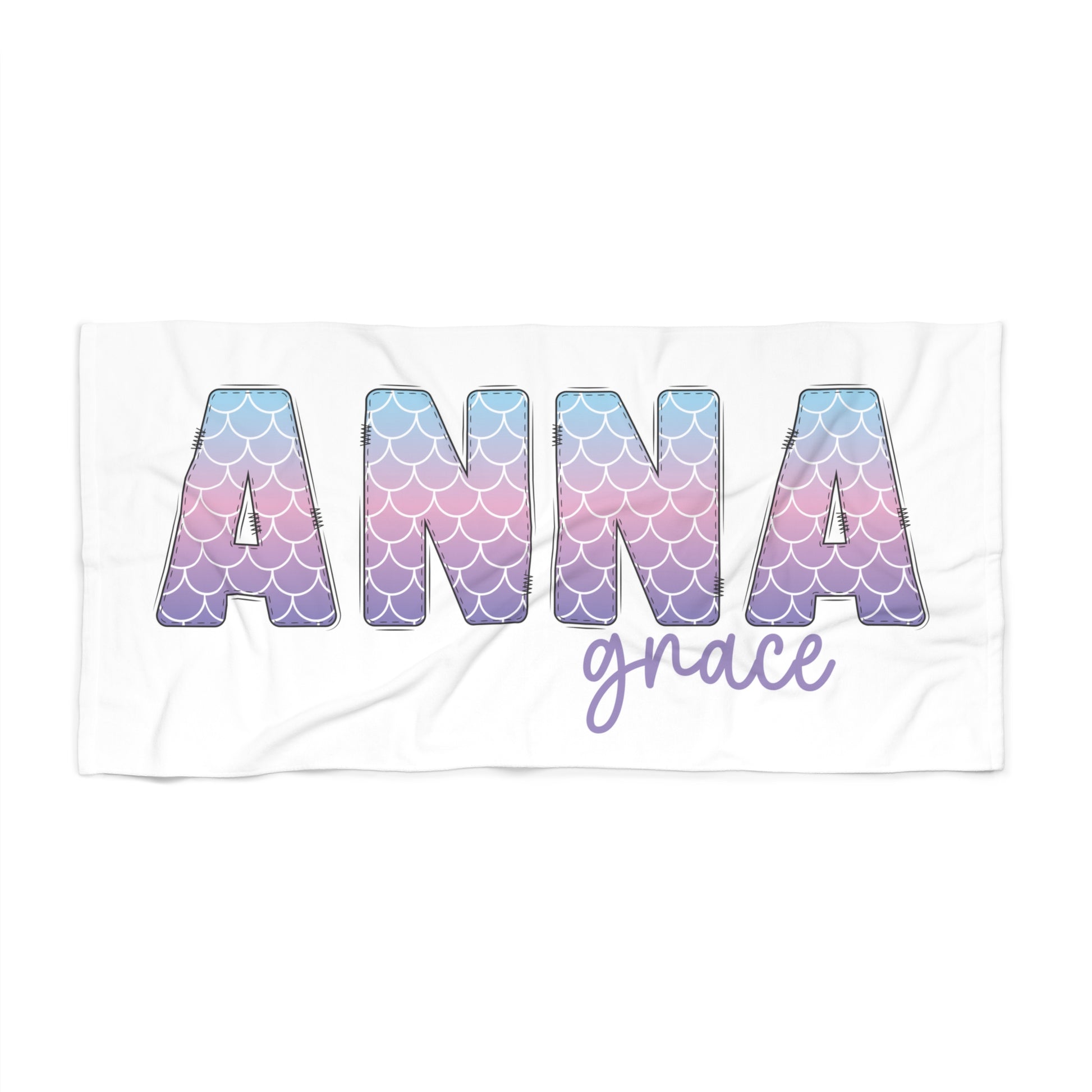 Make beach days magical with this Personalized Mermaid Name Beach Towel! Featuring bold block letters filled with a mermaid scale pattern in a dreamy purple/blue/pink ombre, plus a coordinating script name, this towel is a fun way to keep kids’ towels from getting mixed up at the pool, beach, or summer camp.Why it’s a customer favorite