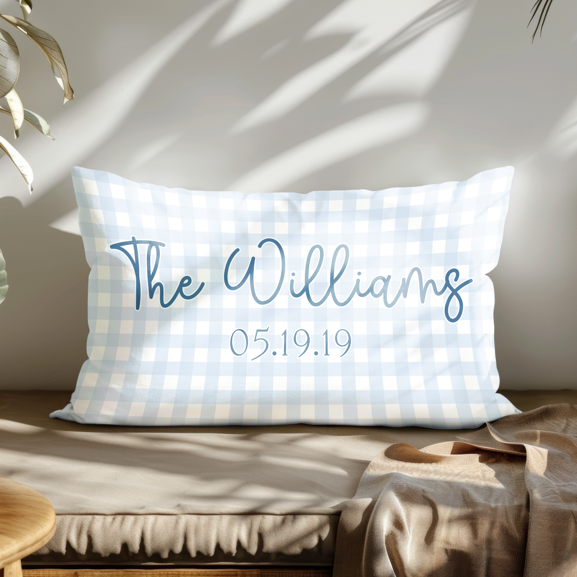 Classic, clean, and preppy—this personalized blue gingham outdoor pillow instantly upgrades your porch, patio, or sunroom. The soft light-blue check background pairs with custom family name text and an optional date (wedding date, anniversary, “established” year, or any meaningful date) for a timeless, tailored look.