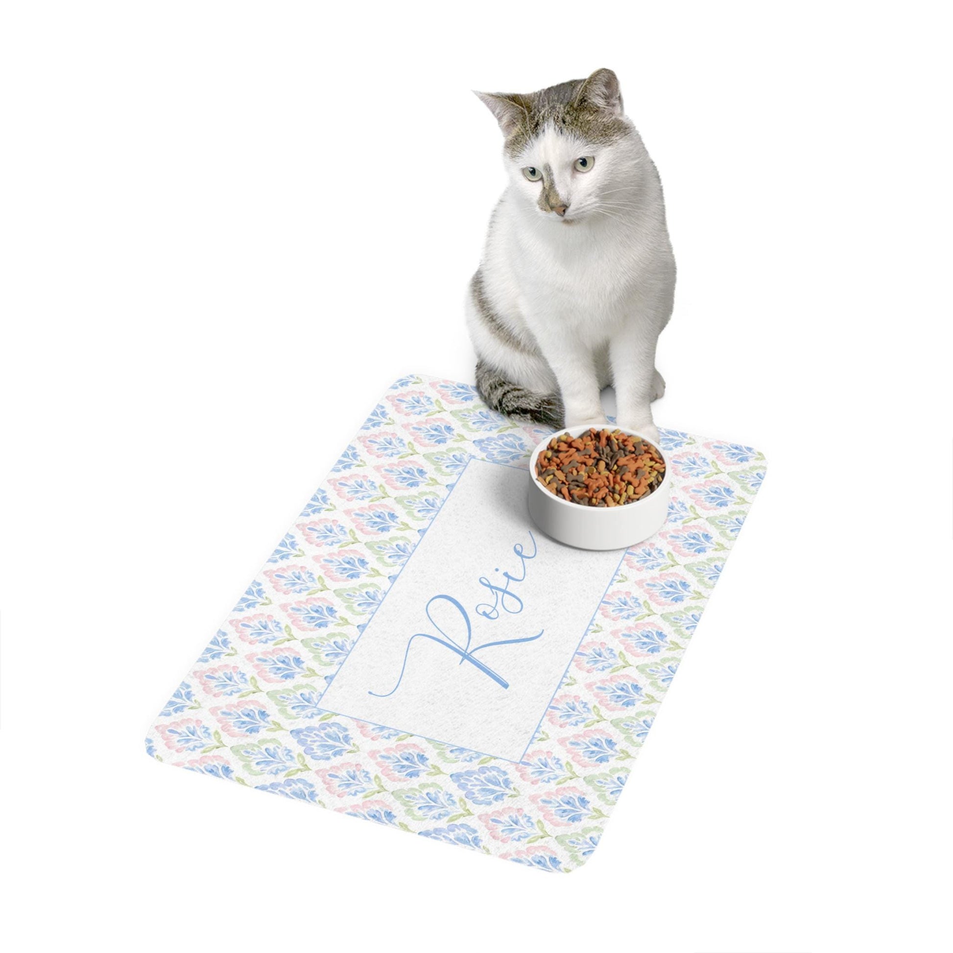 Give your pet’s mealtime a stylish upgrade with this personalized pet food mat, designed with a charming floral grandmillennial print and custom name option. Perfect for keeping floors clean while adding a decorative touch to your home, this waterproof feeding mat makes a thoughtful gift for dog moms, cat lovers, and new pet parents.