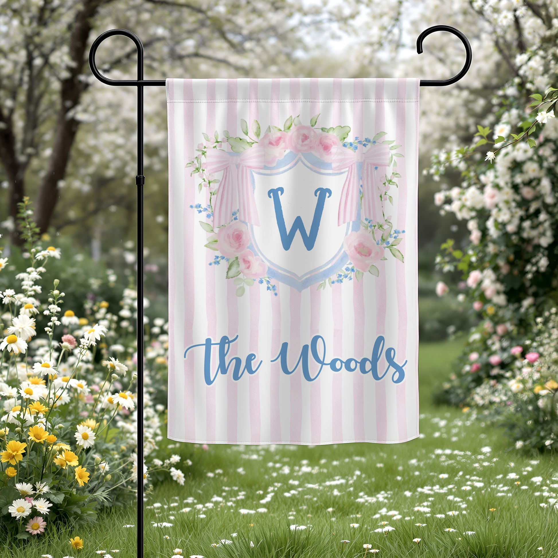 A soft, sunny welcome for porches and garden paths. This vertical garden banner brings vintage charm with its watercolor florals, pastel pink stripes, and a hand-lettered family name beneath a crest. Lightweight poly poplin fabric flutters in the breeze and shows the design on both sides so your entryway looks inviting from every angle. Tuck the included top sleeve over a standard garden flag pole and let the delicate roses and draped ribbon set a warm, cottage-like mood for visitors arriving for brunch, a baby shower, or an afternoon tea in the yard.