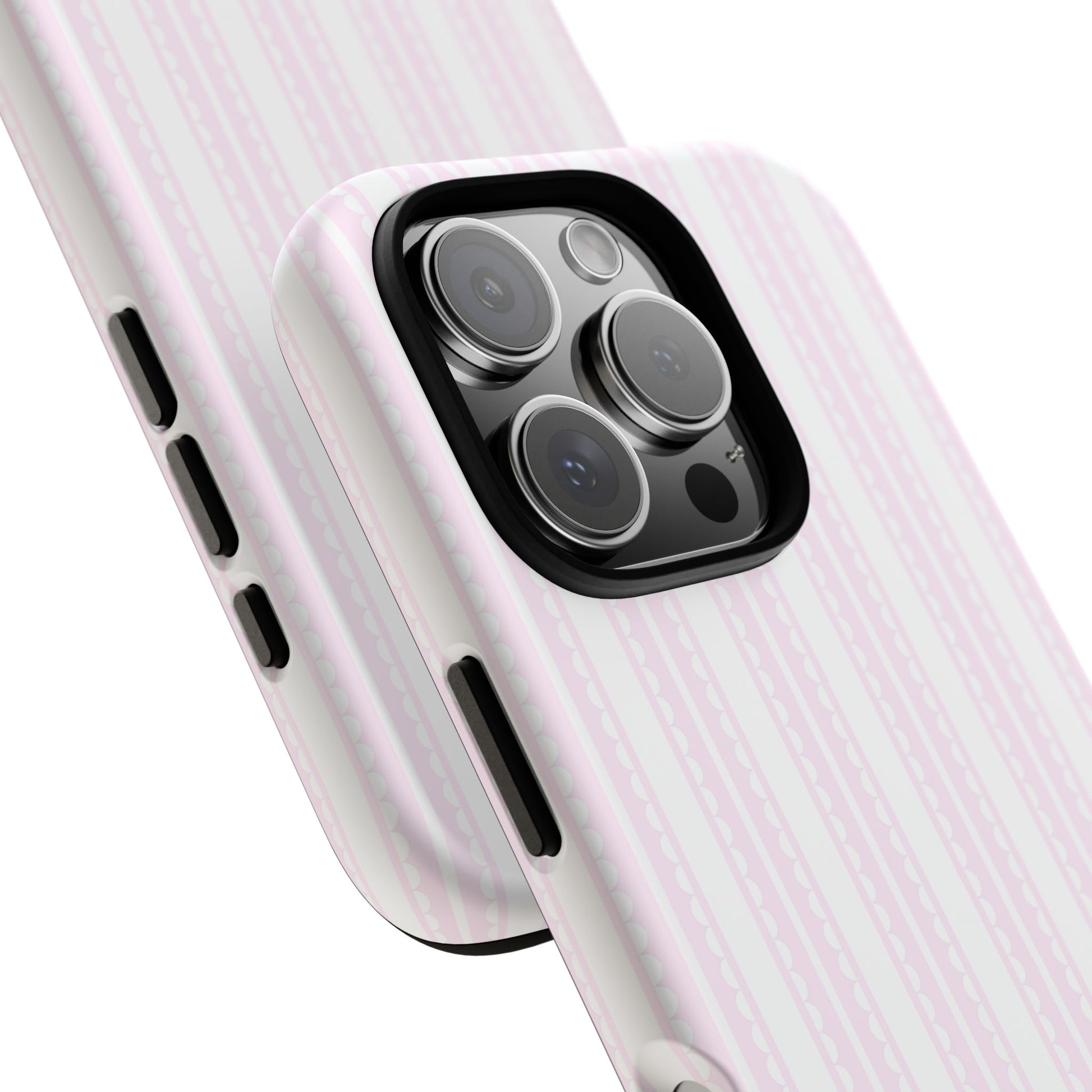 Soft, feminine, and perfectly preppy—this personalized pink stripe phone case features crisp vertical pinstripes with a delicate scallop/lace-inspired edge detail in blush pink. Finished with your custom initials, it’s a clean coquette look that still feels classic and polished.