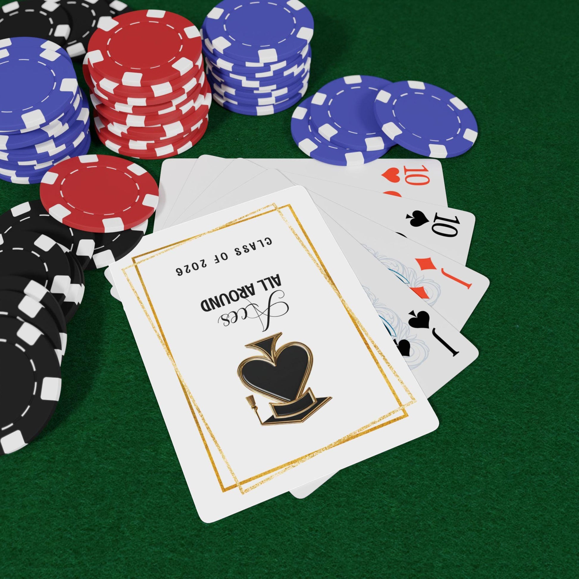 Celebrate the Class of 2026 in style with these custom “Aces All Around” playing cards — the perfect mix of sophistication and fun. Each deck features a sleek black and gold spade design topped with a graduation cap for that one-of-a-kind keepsake look.
