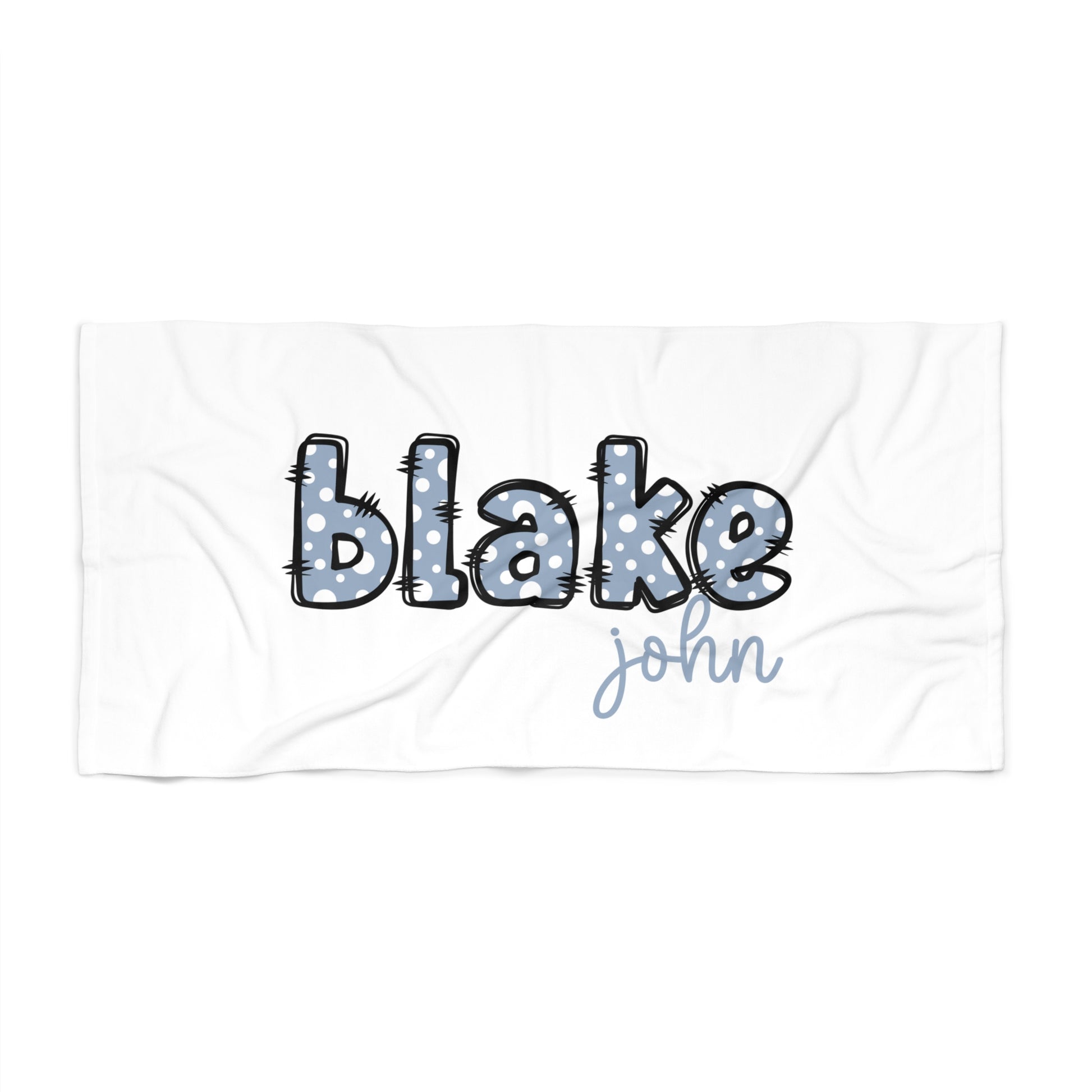 Make towel mix-ups a thing of the past with this Personalized Polka Dot Name Beach Towel featuring fun blue polka-dot bubble letters and a coordinating script name. The playful outlined lettering stands out on the sand and pool deck—perfect for kids, tweens, and camp days.Perfect forBeach trips, pool days, lake weekends, cruisesSwim lessons, swim team, water parksSummer camp & sleepaway camp (easy to identify!)Birthday gifts, back-to-school summer essentials, sibling setsDesign detailsLarge bubble letter name with polka dots + bold outlineSmaller script name underneath (optional second line)Clean, modern look that works for boys or girlsPlease noteI print exactly what you type—please double-check spelling and capitalization.Colors may vary slightly due to screen settings and printing.Want different colors (navy, red, teal, pink)? Message me for custom options.Product features- Durable polyester print side that holds color and dries quickly- Soft cotton loop backing for strong absorbency and plush feel- Hemmed edges for reinforced long-lasting construction- Available in two sizes: 30"×60" and 36"×72"- One-sided print; white cotton loop backing; compliant with safety standardsCare instructions- Wash the item only cold machine wash with similar colors garments using a gentle cycle. Tumble dry on low settings or hang dry. Do not bleach or dry clean.