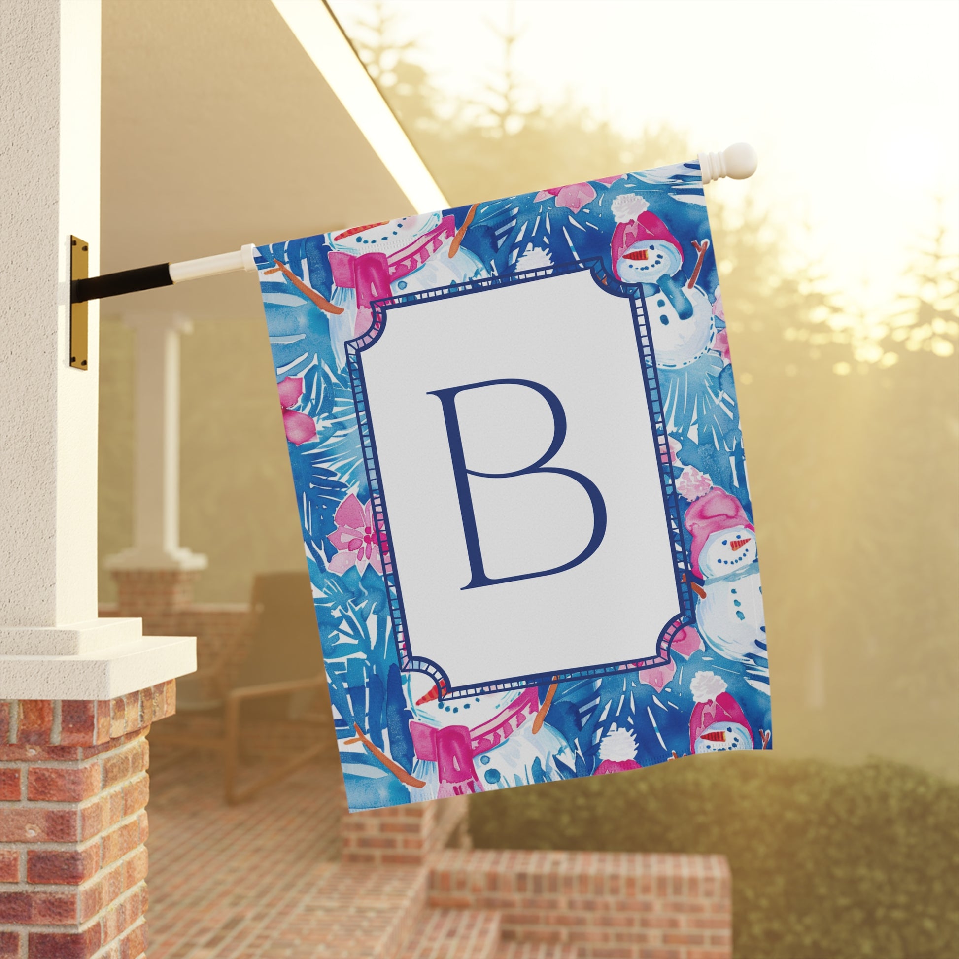Make your porch feel extra cheerful with this personalized snowman garden flag! This design features adorable watercolor snowmen in a pink-and-blue preppy winter palette with floral accents and a crisp monogram frame—perfect for Christmas decorating, winter porch décor, and gift-giving.