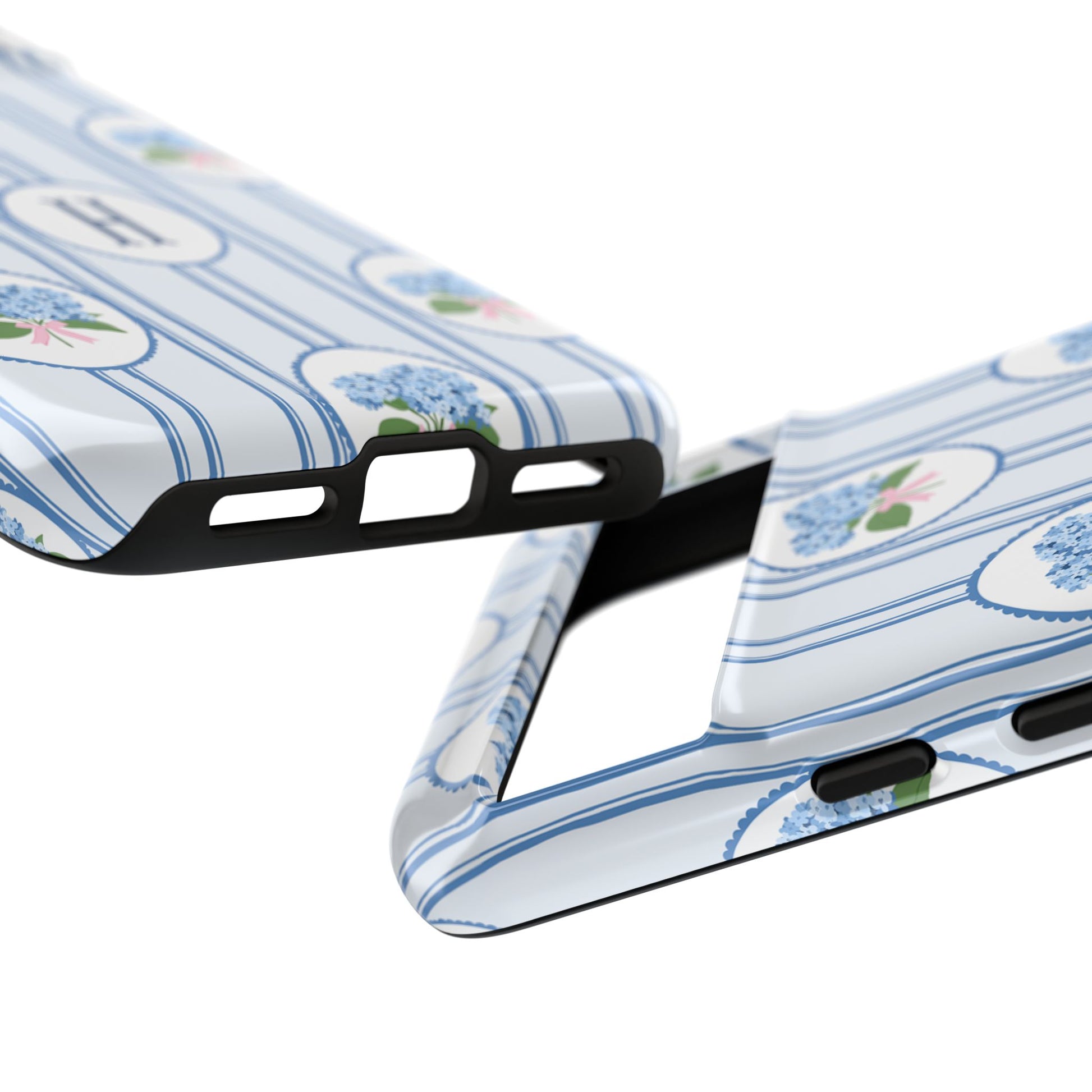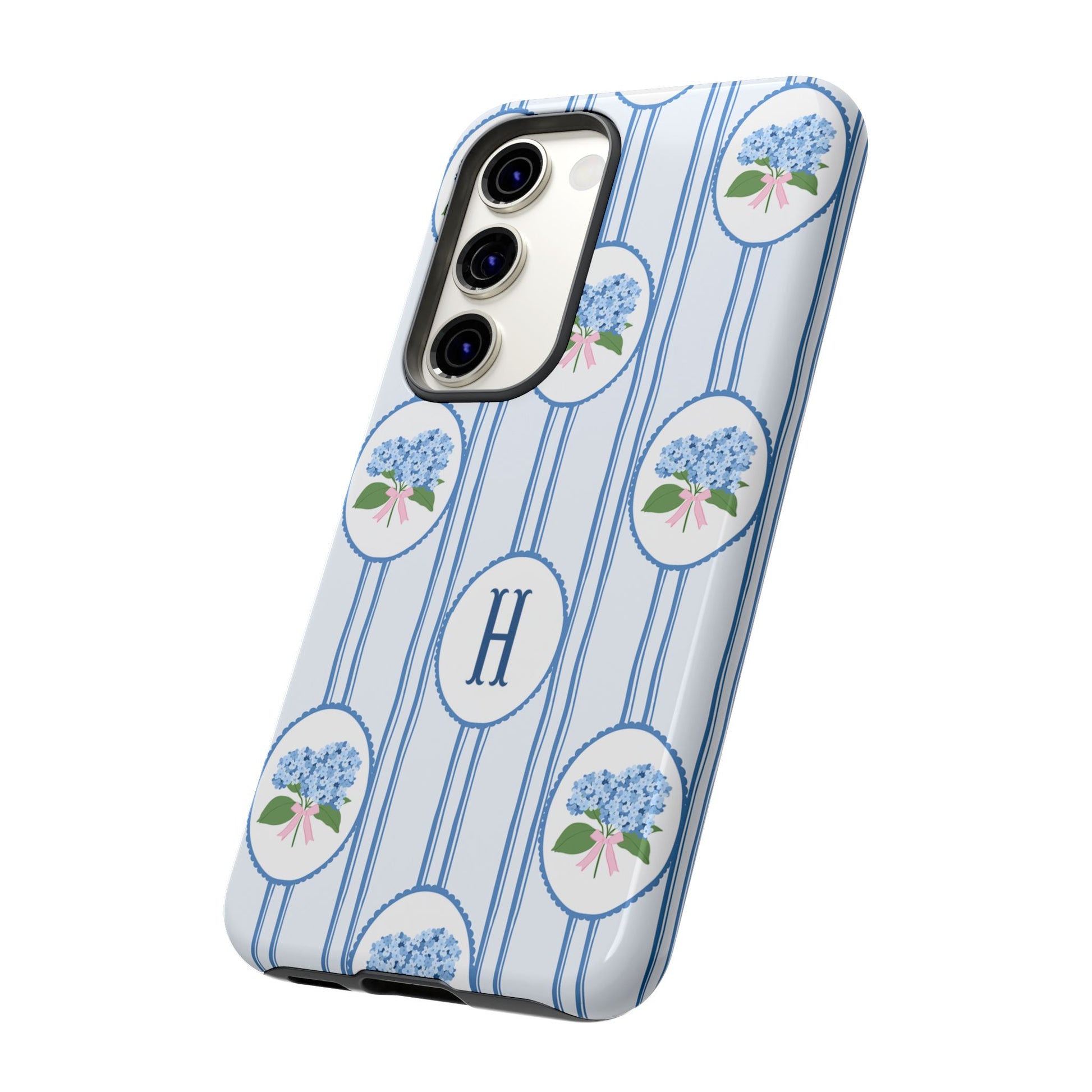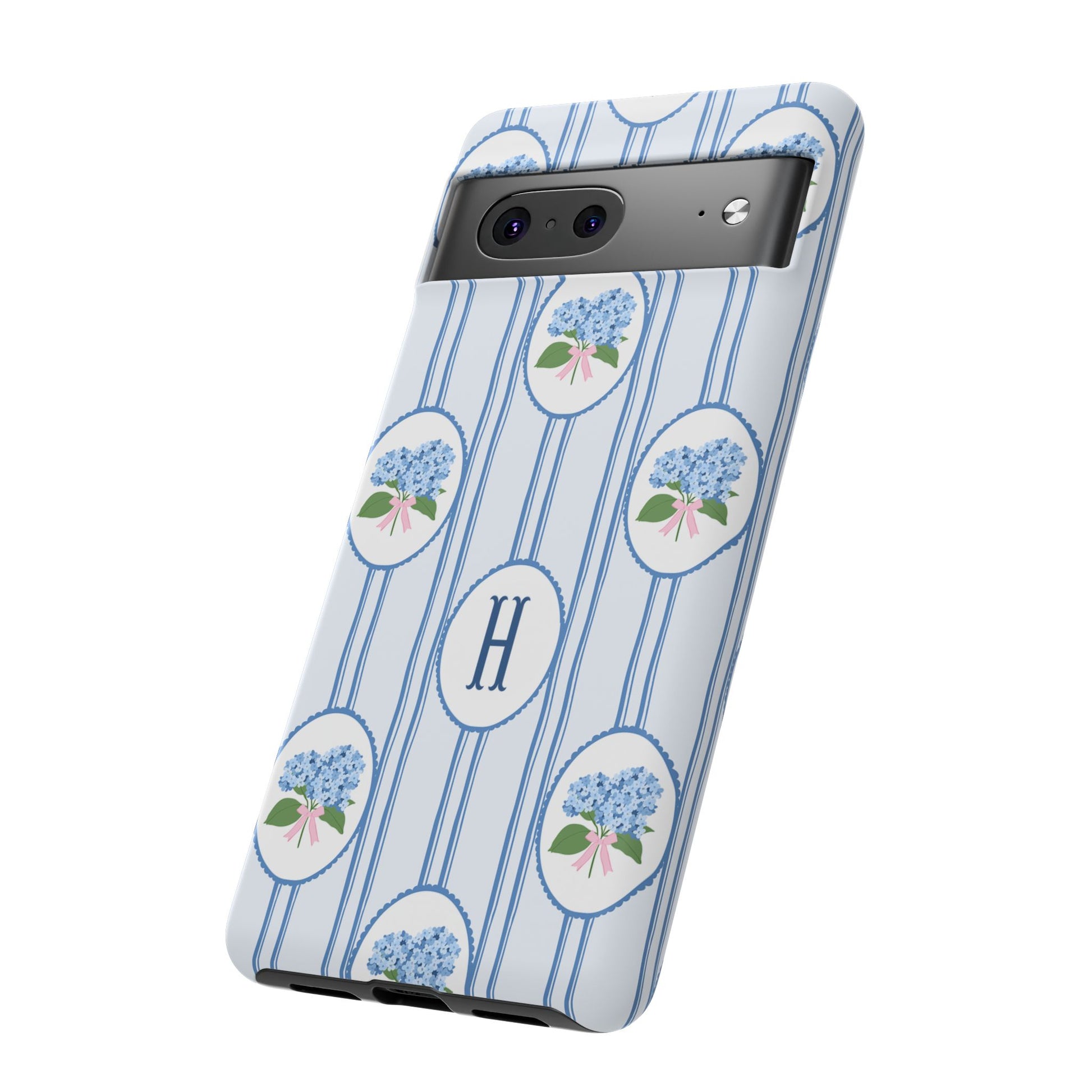 A slim, protective phone case wrapped in a soft, vintage-inspired pattern. Pale blue vertical stripes carry delicate oval medallions filled with tiny blue hydrangea clusters and a subtle pink bow—an elegant, quietly feminine look. The dual-layer build absorbs shocks while the glossy or matte printed shell preserves the fine linework and monogrammed center option. This case slips into everyday life without shouting: it dresses up a work bag, keeps a phone safe on crowded commutes, and adds a gentle, nostalgic touch to weekend coffee runs or garden mornings. The feel is refined but lived-in, for someone who notices small botanical details and prefers timeless charm over flash.