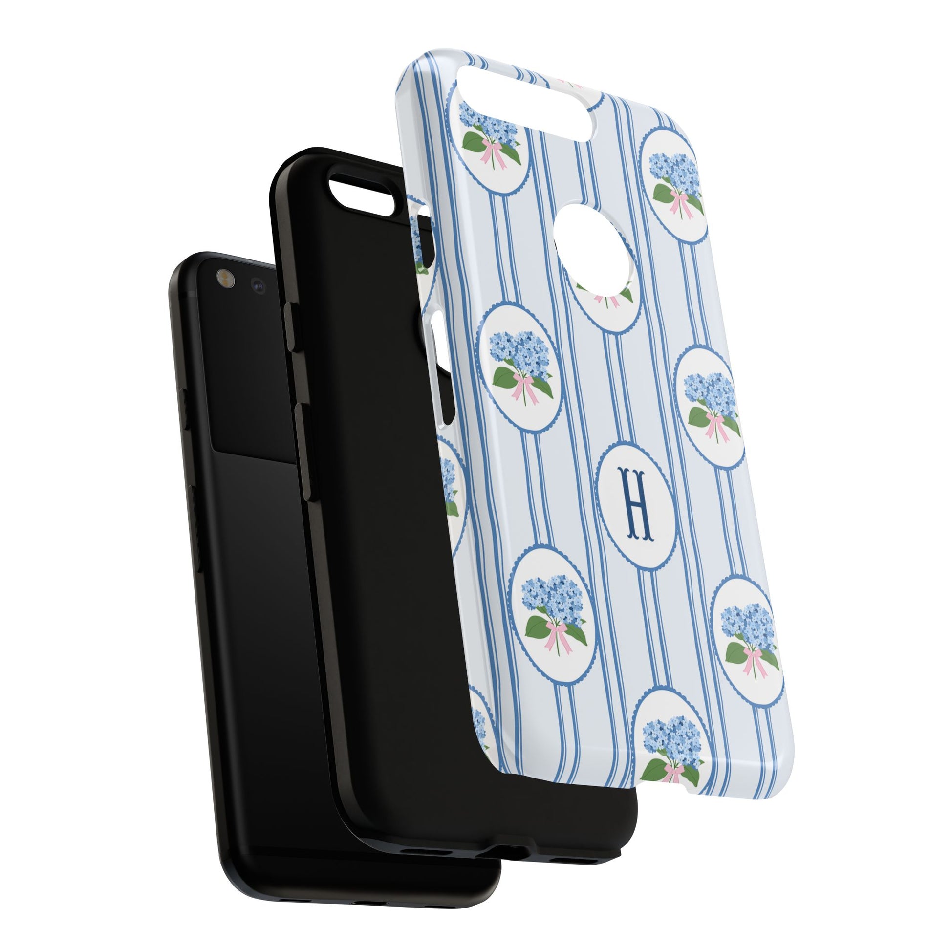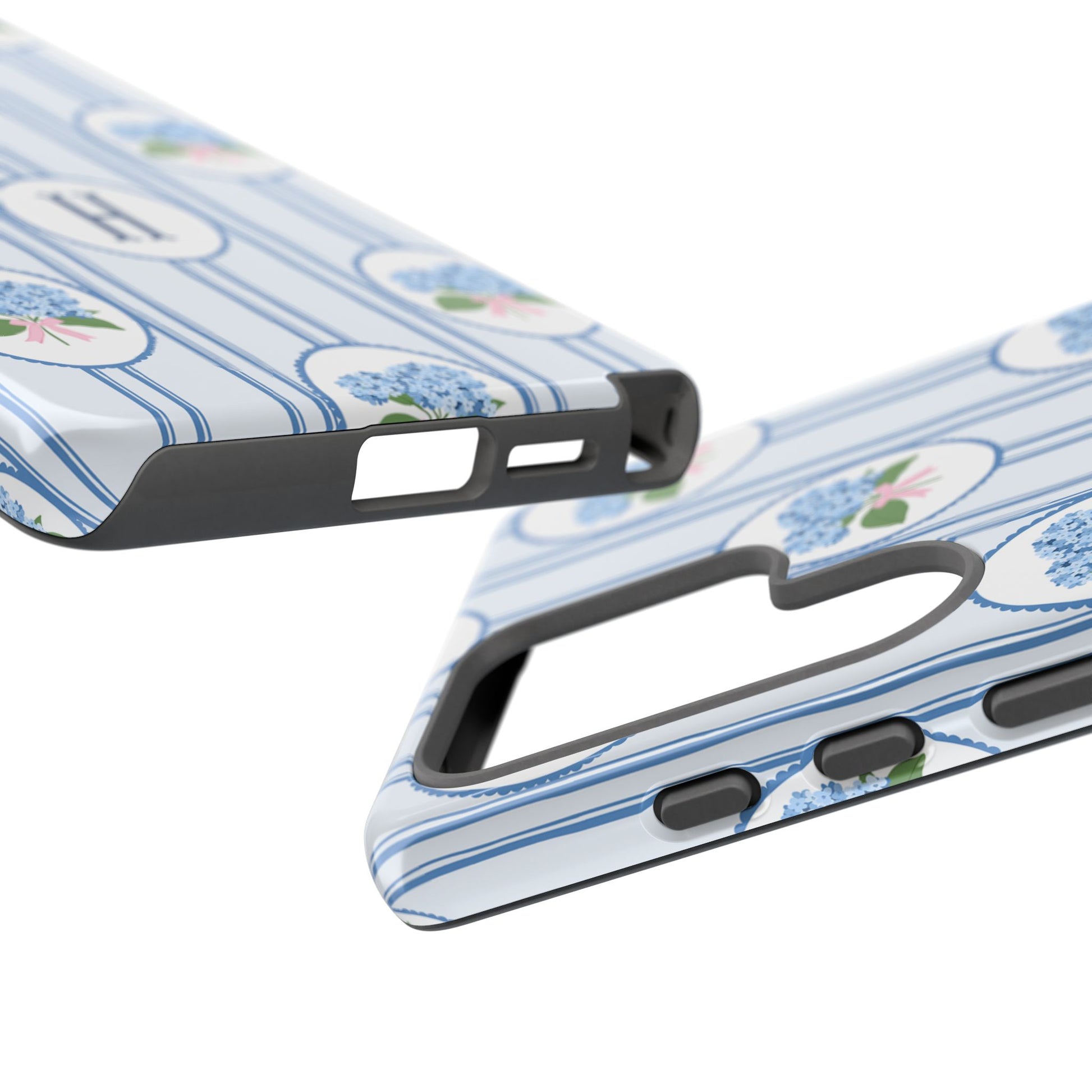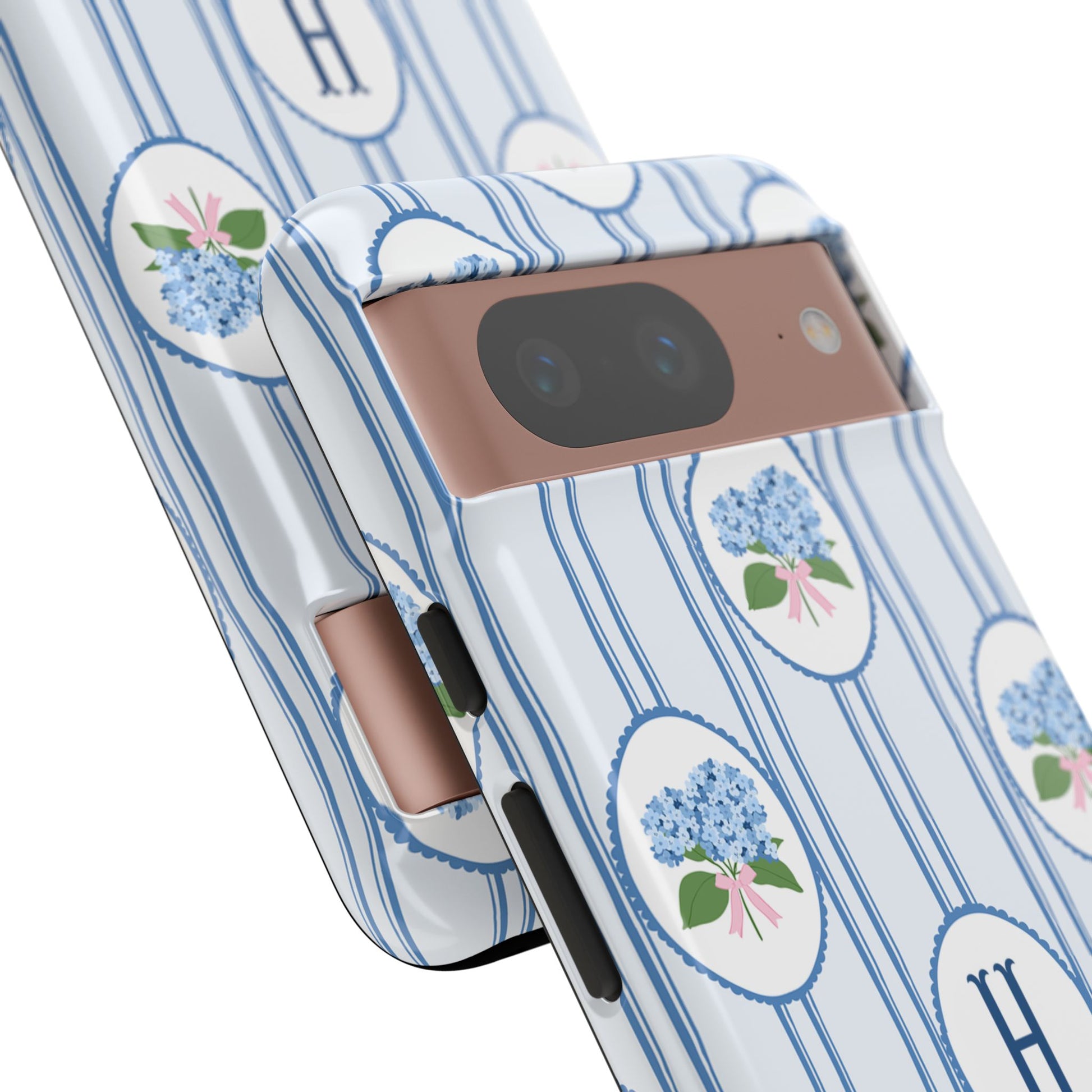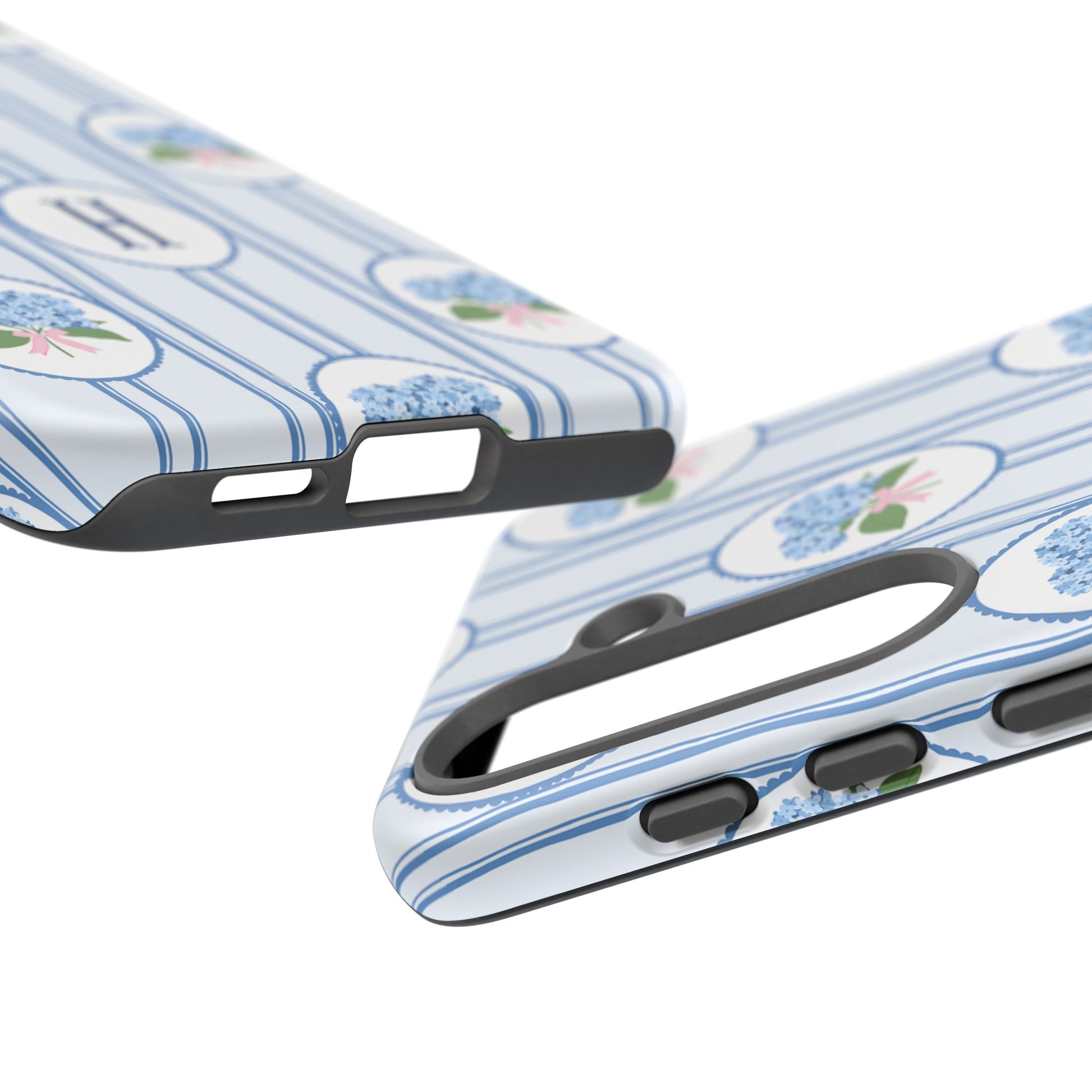 A slim, protective phone case wrapped in a soft, vintage-inspired pattern. Pale blue vertical stripes carry delicate oval medallions filled with tiny blue hydrangea clusters and a subtle pink bow—an elegant, quietly feminine look. The dual-layer build absorbs shocks while the glossy or matte printed shell preserves the fine linework and monogrammed center option. This case slips into everyday life without shouting: it dresses up a work bag, keeps a phone safe on crowded commutes, and adds a gentle, nostalgic touch to weekend coffee runs or garden mornings. The feel is refined but lived-in, for someone who notices small botanical details and prefers timeless charm over flash.