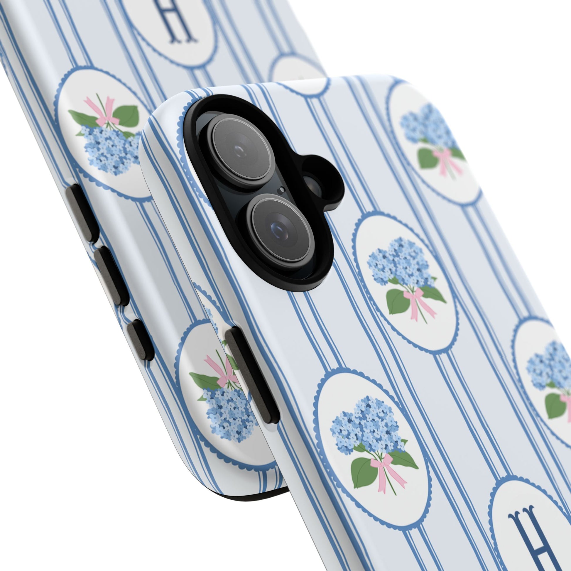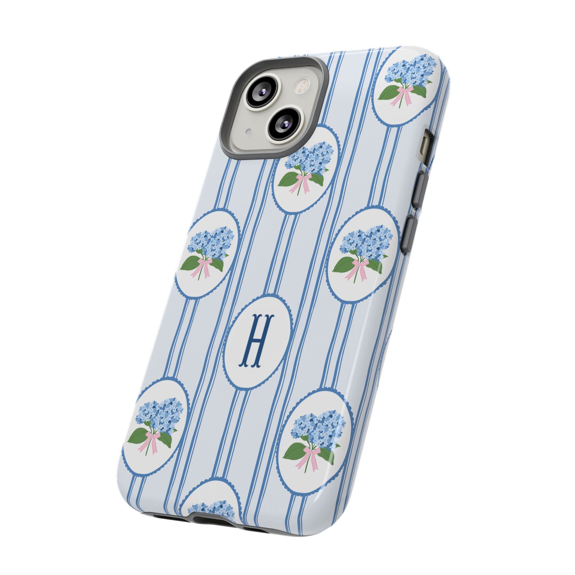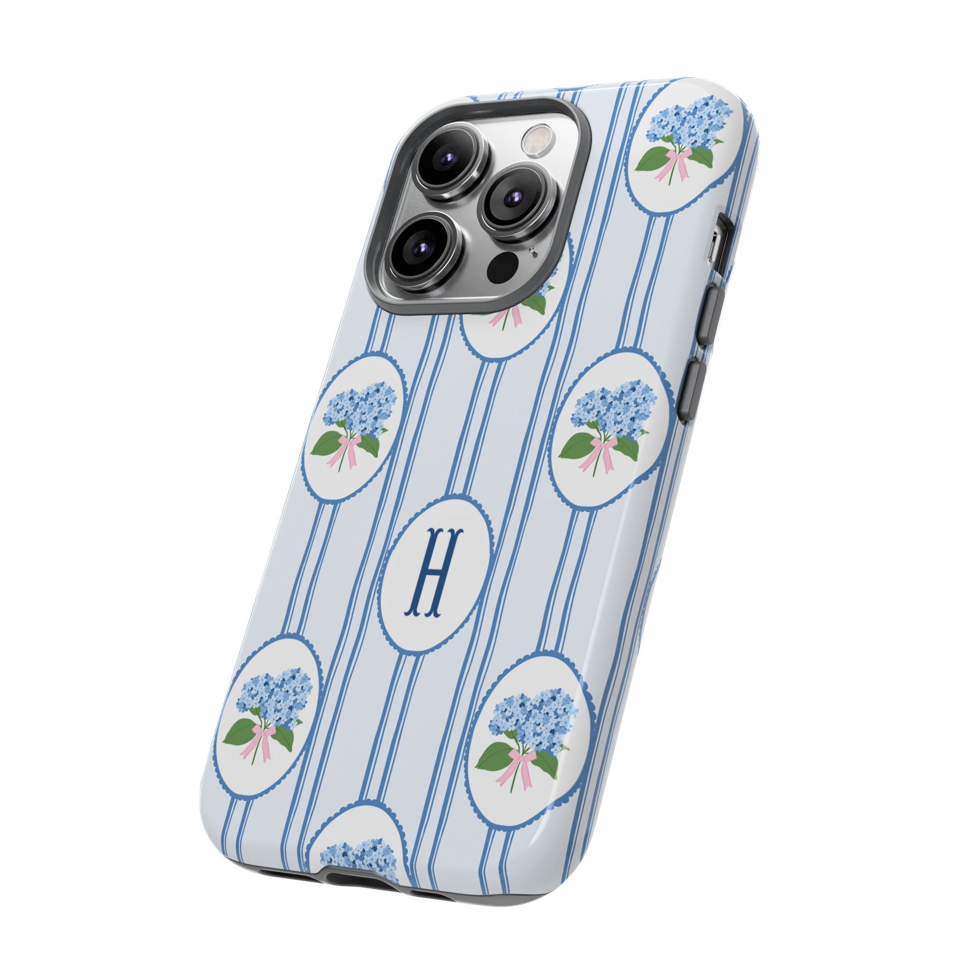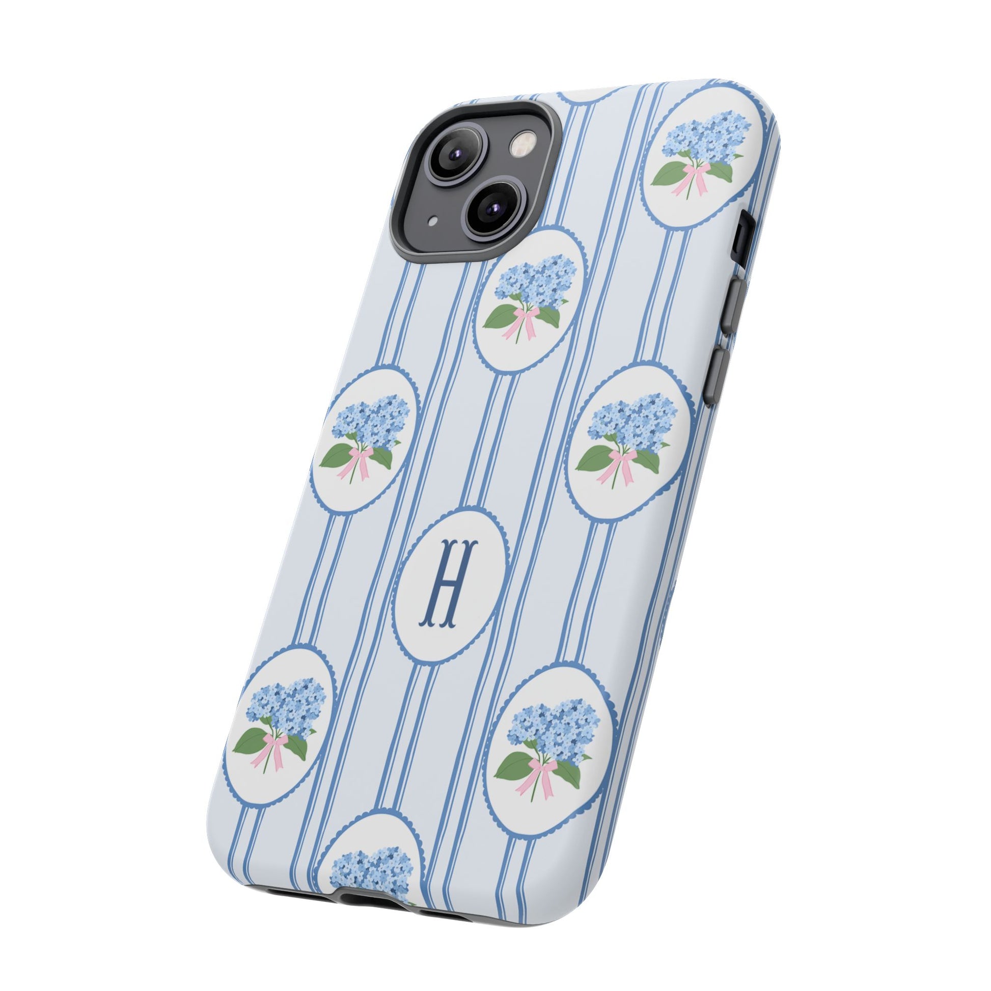 Meet your new favorite Monogram phone case—a trendy iPhone case with classic preppy charm. This custom personalized design features blue hydrangea bouquets in scalloped cameo frames over soft blue stripes, finished with a bold monogram initial. It’s timeless and current—aka the perfect modern case for everyday.