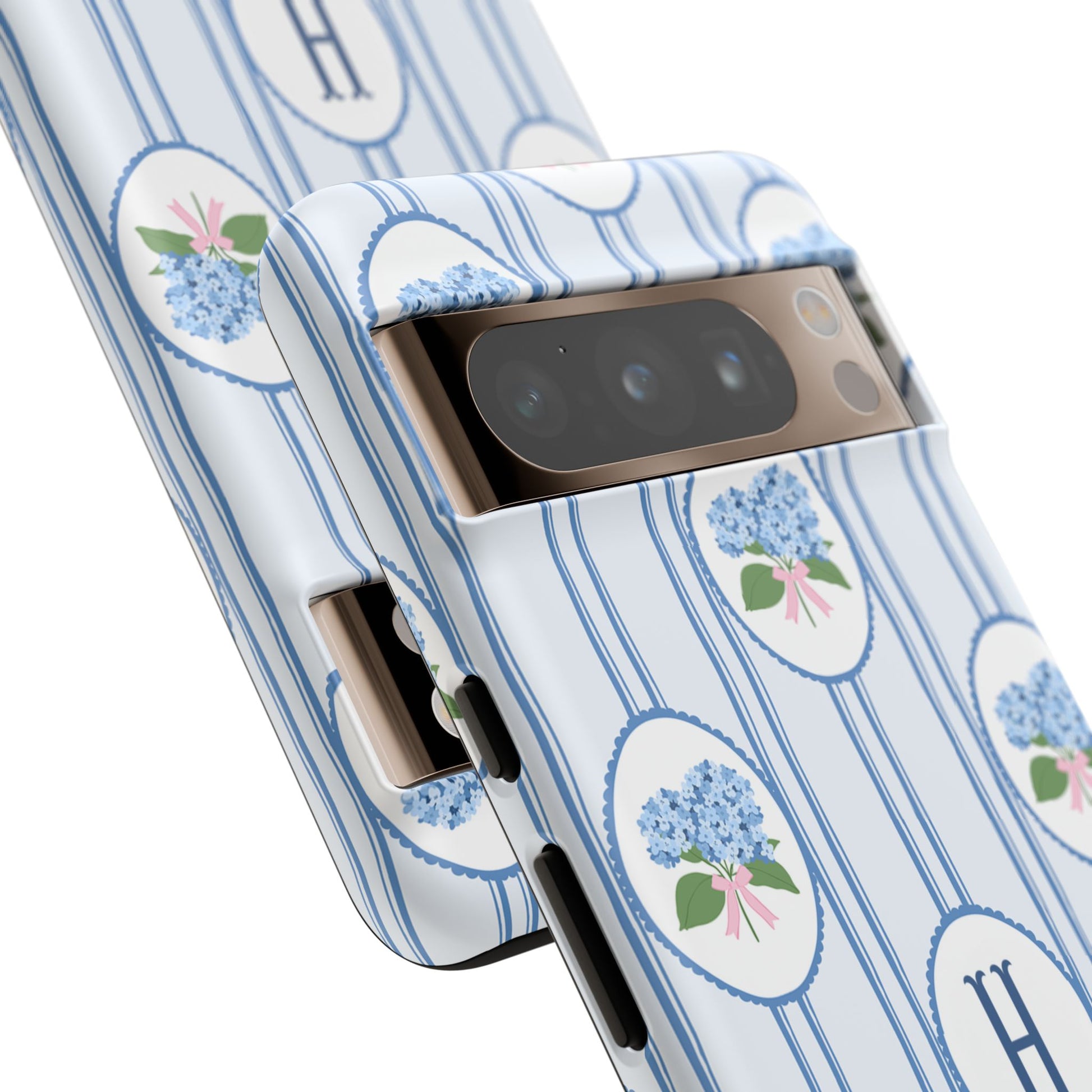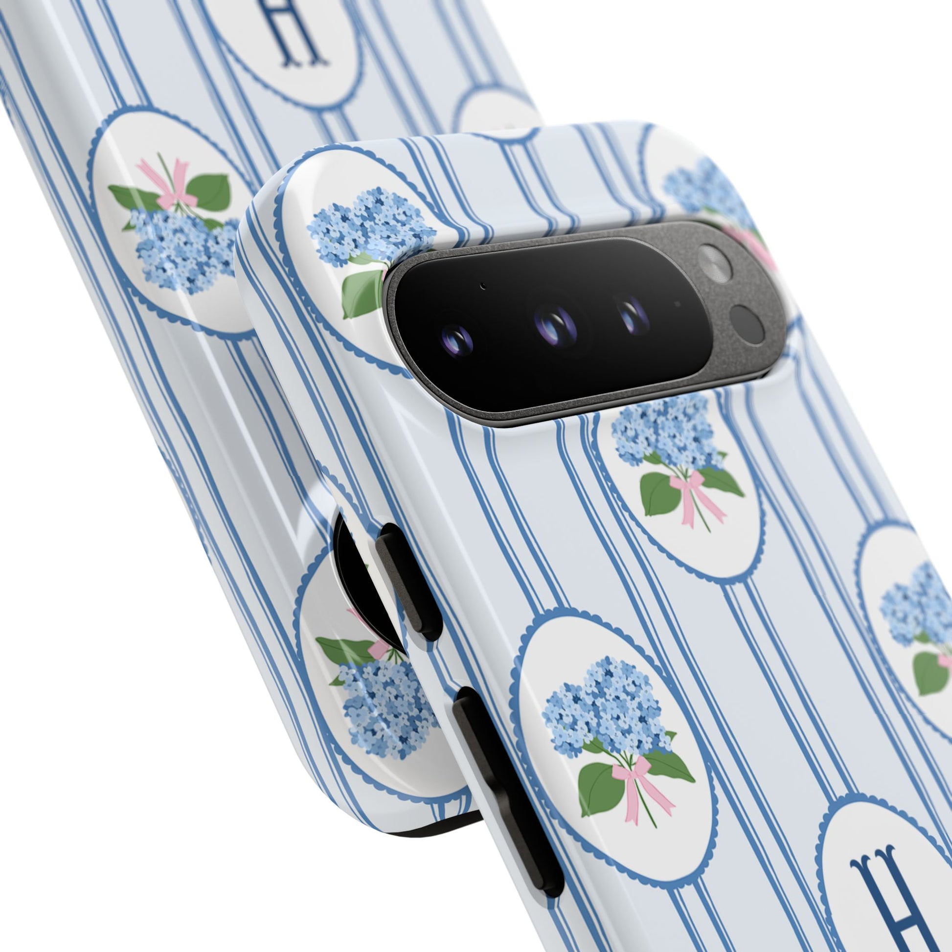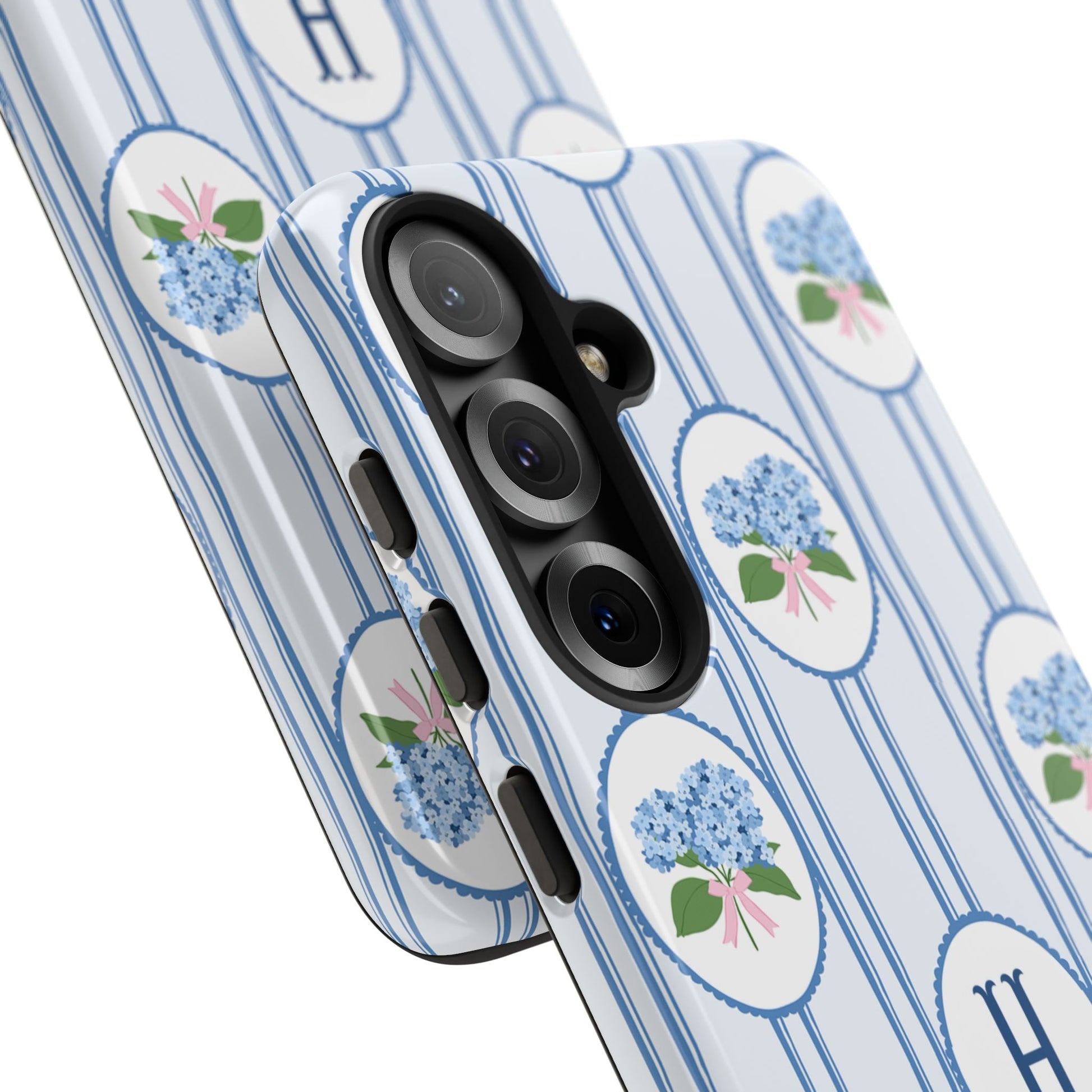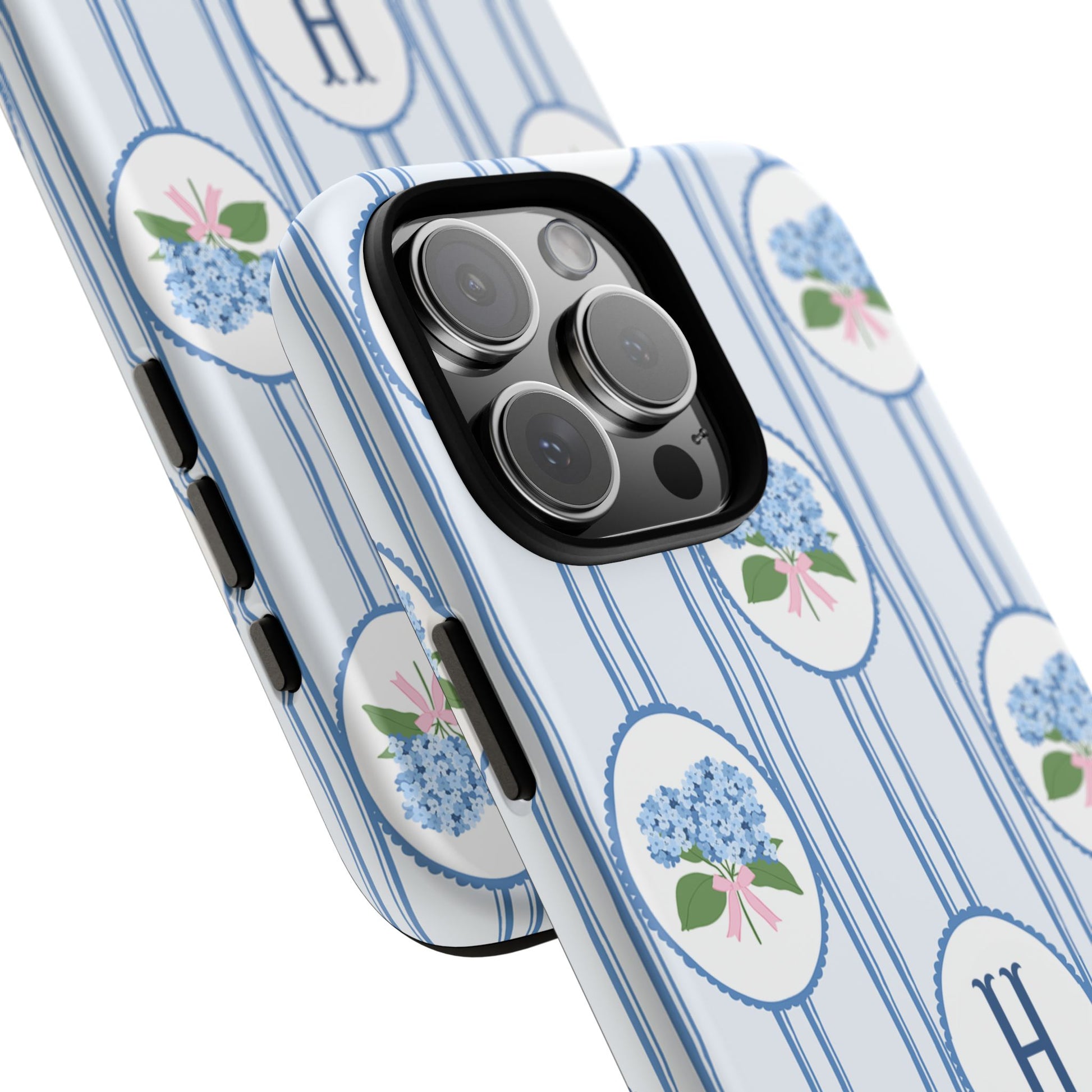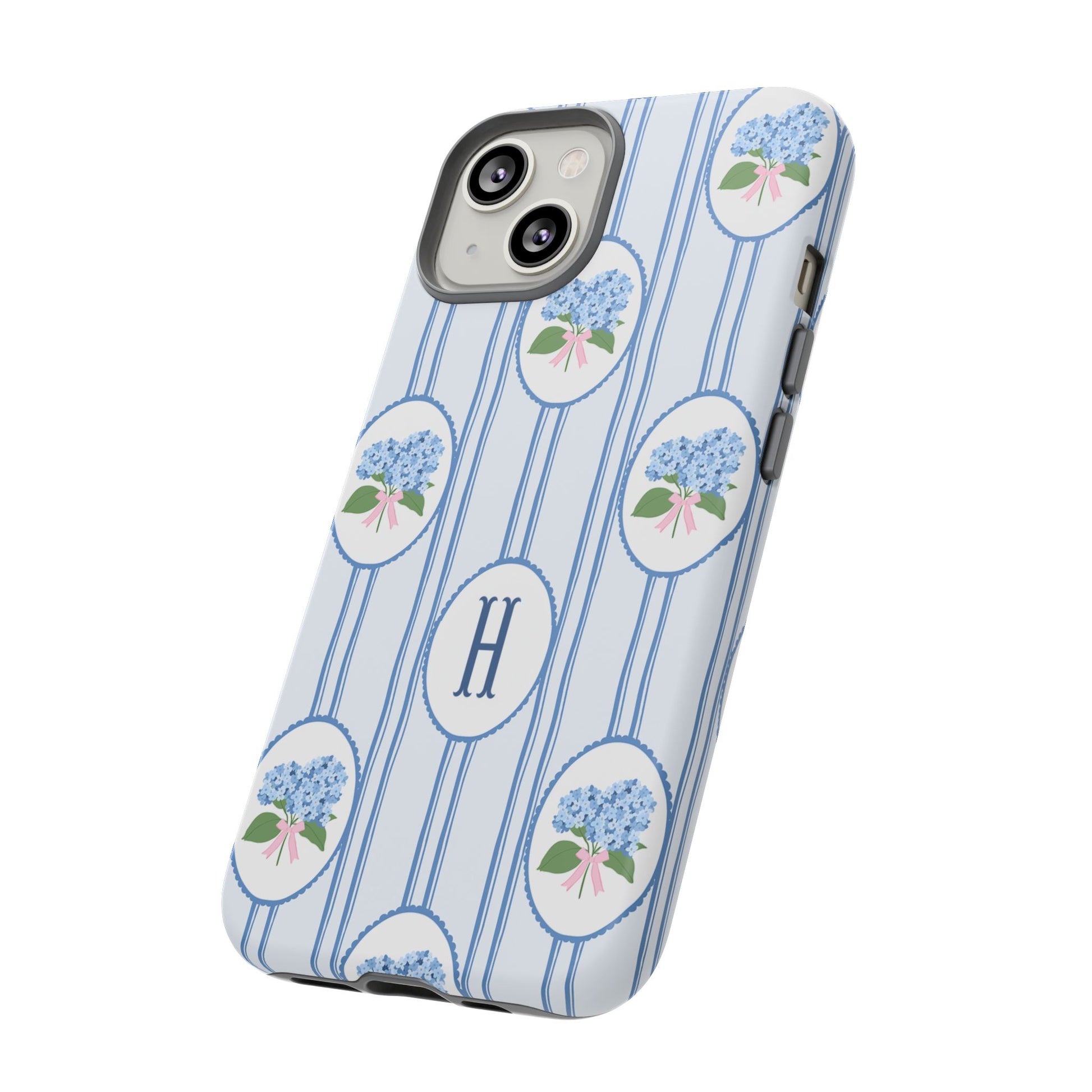 Meet your new favorite Monogram phone case—a trendy iPhone case with classic preppy charm. This custom personalized design features blue hydrangea bouquets in scalloped cameo frames over soft blue stripes, finished with a bold monogram initial. It’s timeless and current—aka the perfect modern case for everyday.