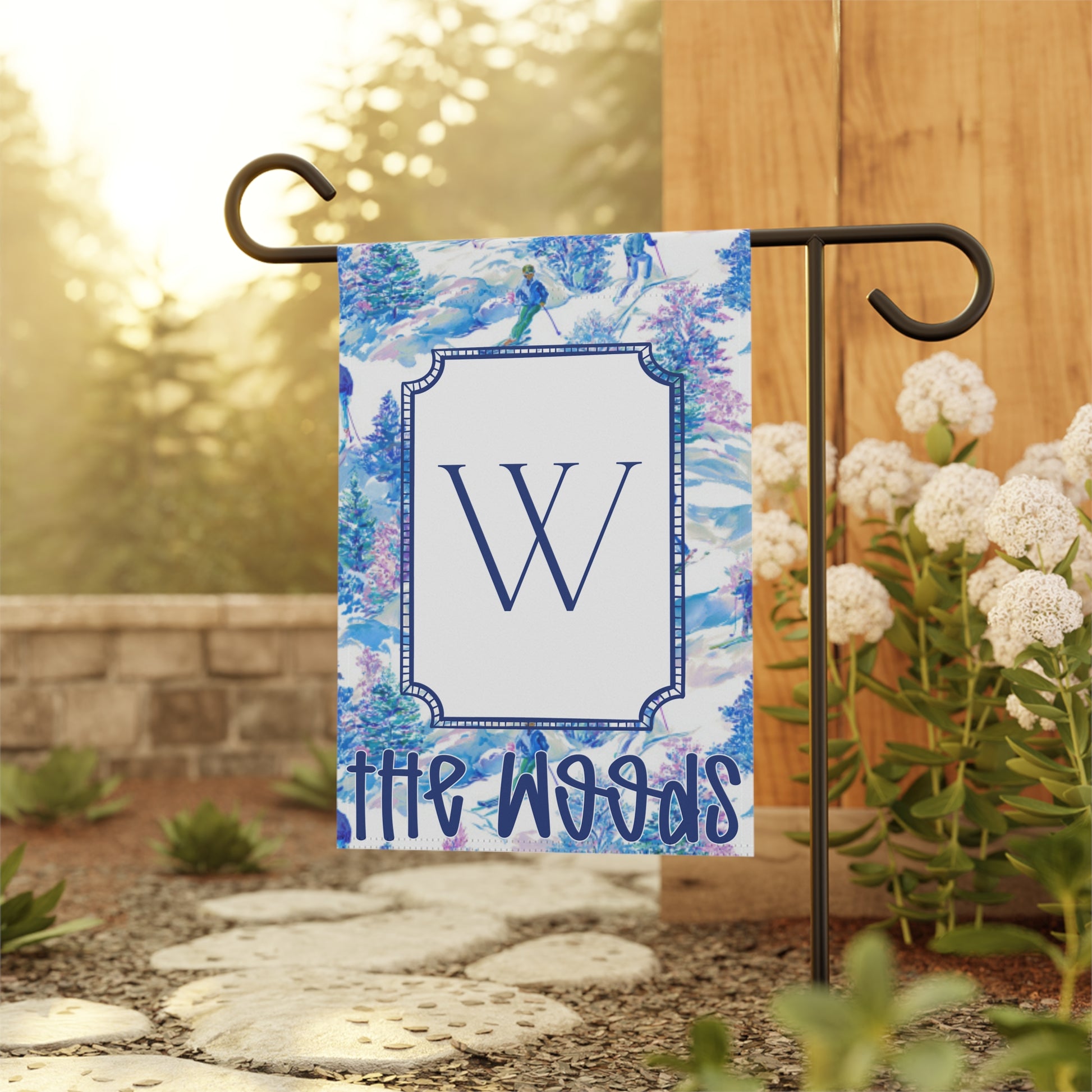 Bring classic preppy ski-lodge charm to your entryway with this personalized winter ski toile garden flag. Featuring a snowy skier scene in icy blues with soft pink accents, plus a crisp monogram frame and your custom name, it’s perfect for ski house décor, cabin décor, chalet décor, and winter outdoor decorating.
