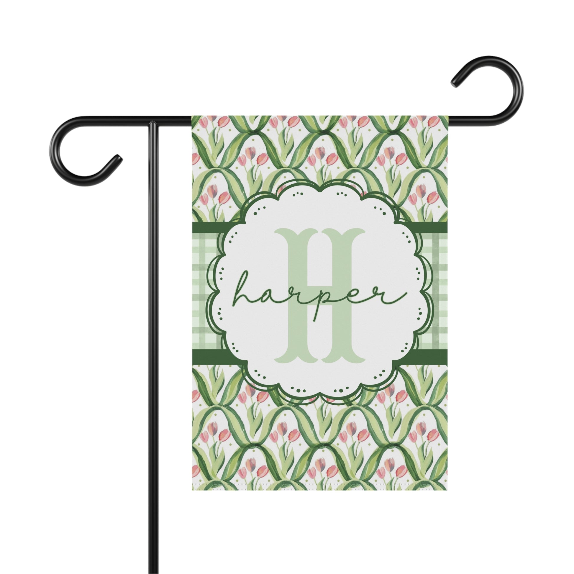 A soft, garden-fresh banner that brings an easy, personal touch to porches and flower beds. Printed front and back on a lightweight poly poplin-canvas, this vertical garden banner shows a hand-painted tulip motif, gingham accents, and a scalloped medallion for a single initial and name. It hangs from the top sleeve on any standard garden pole, so it layers naturally against blooming shrubs or a painted front door. The colors stay bright through repeated outdoor display thanks to modern printing techniques, and the subtle black backing adds depth so the artwork reads cleanly from both sides. Let this piece speak for your home — gentle, cultivated, and quietly personal.