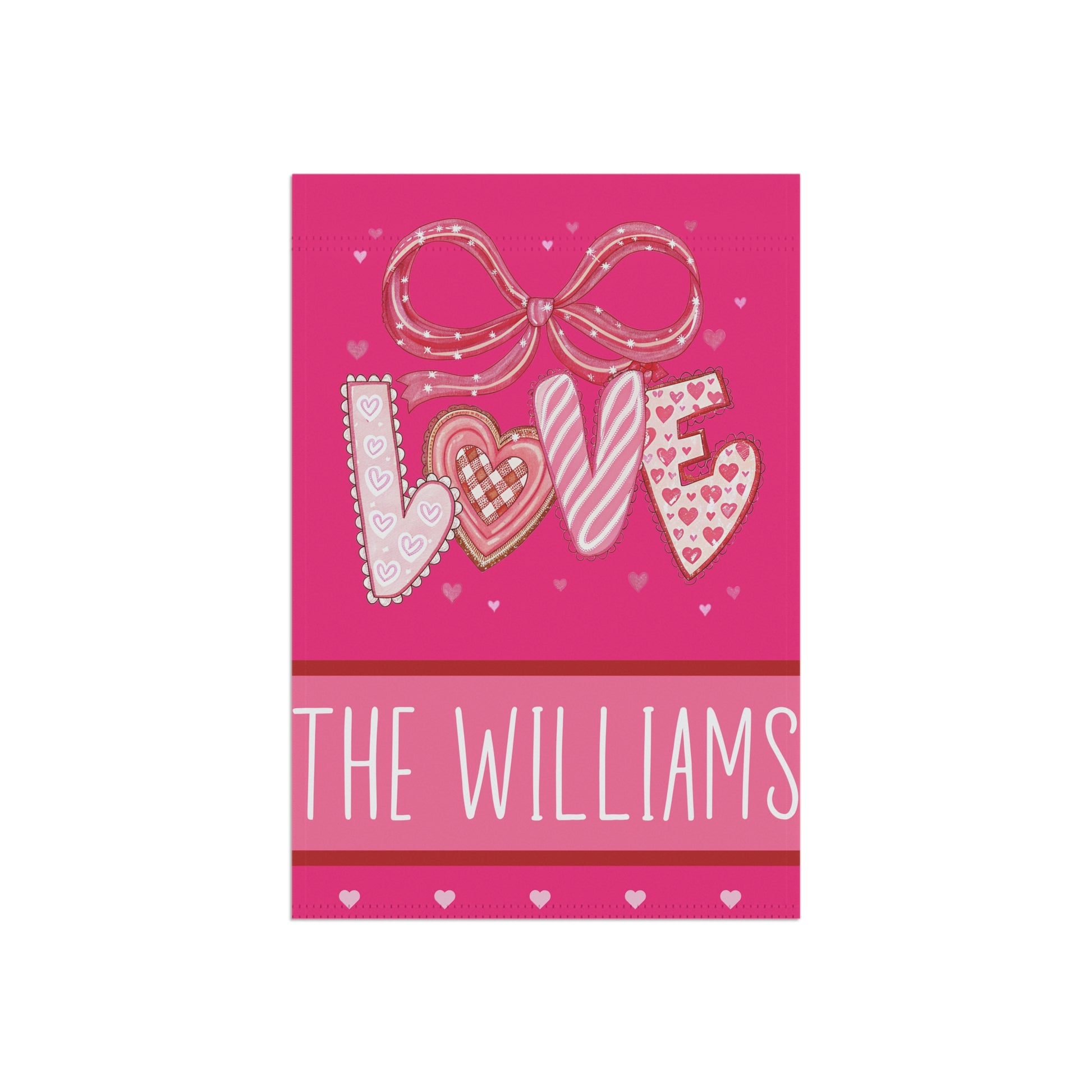 Each letter in “LOVE” is styled with hearts, candy stripes, and gingham patterns, topped with a sweet polka dot bow. Below, your custom family name is prominently displayed—making this the perfect welcoming piece for your yard, porch, or garden.