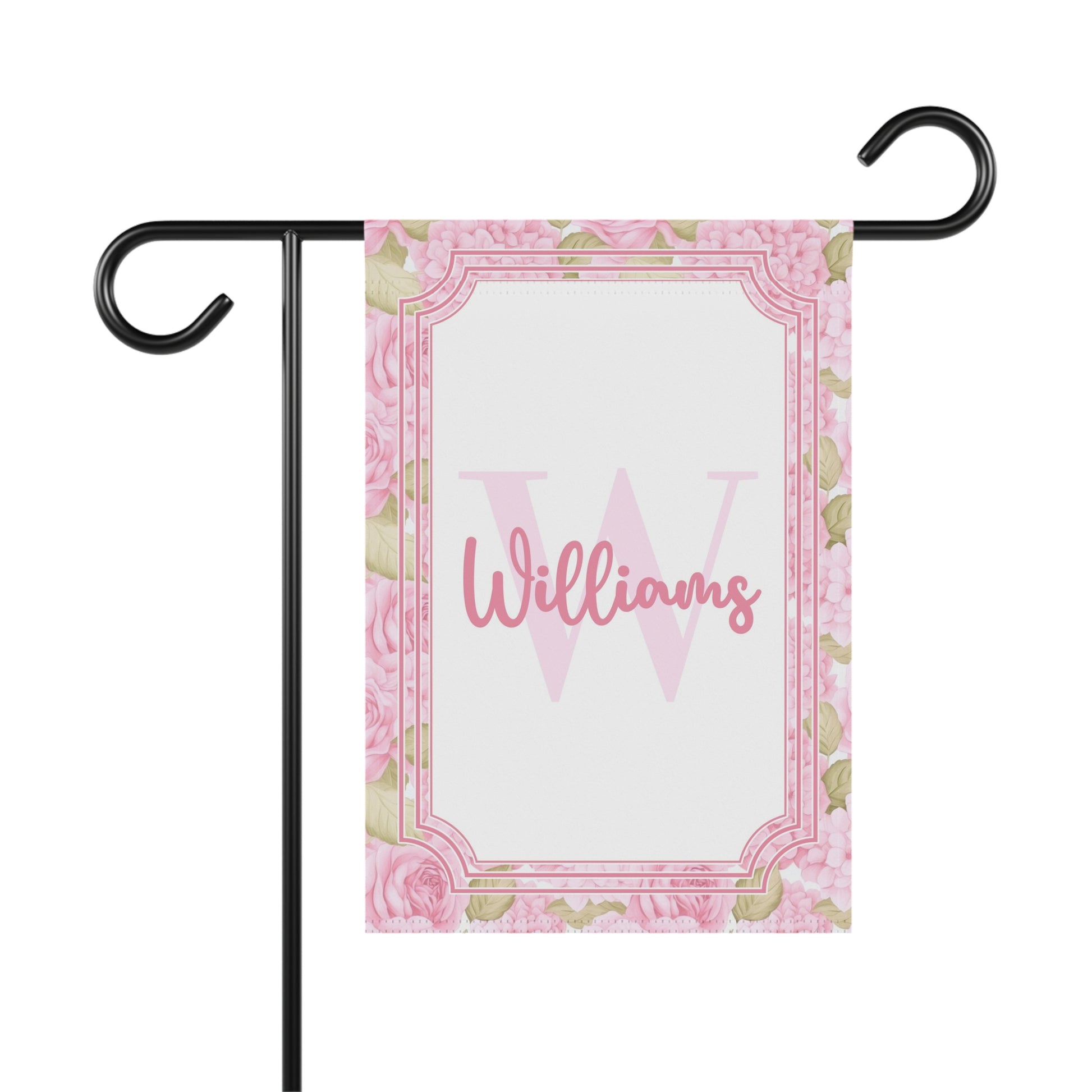Soft, vintage-inspired florals frame a pale monogram in gentle pinks — a garden banner that feels like a handwritten note on a spring morning. Lightweight poly poplin gives it a graceful drape on a standard garden pole, while rich, vivid printing keeps the roses and leafy accents lively through many seasons. The double-sided print (flipped on the long edge) means the Williams monogram reads beautifully from either direction, and the black lining subtly hides the reverse side for a cleaner look. Hang it to welcome guests, mark the pathway to your porch, or tuck it into a floral bed to echo blooming borders — it brings a warm, personal touch without overwhelming the garden’s own voice.