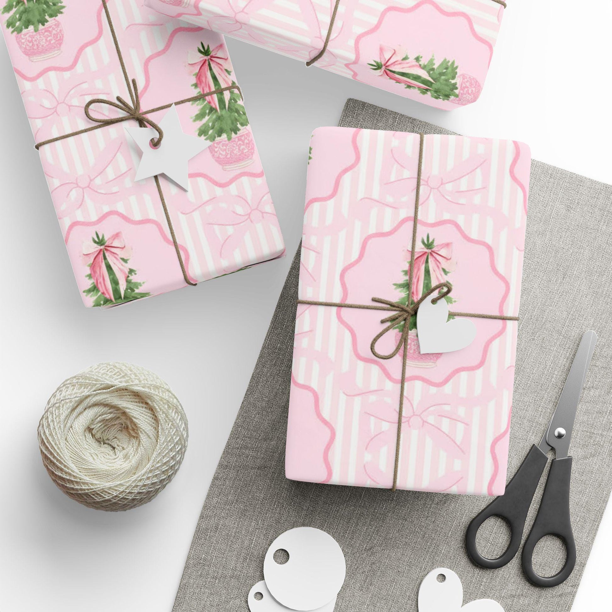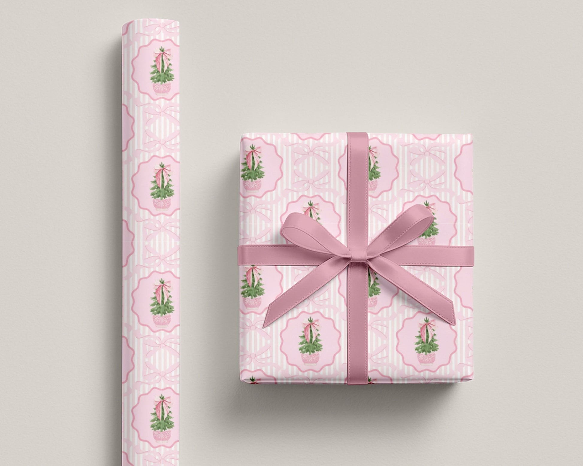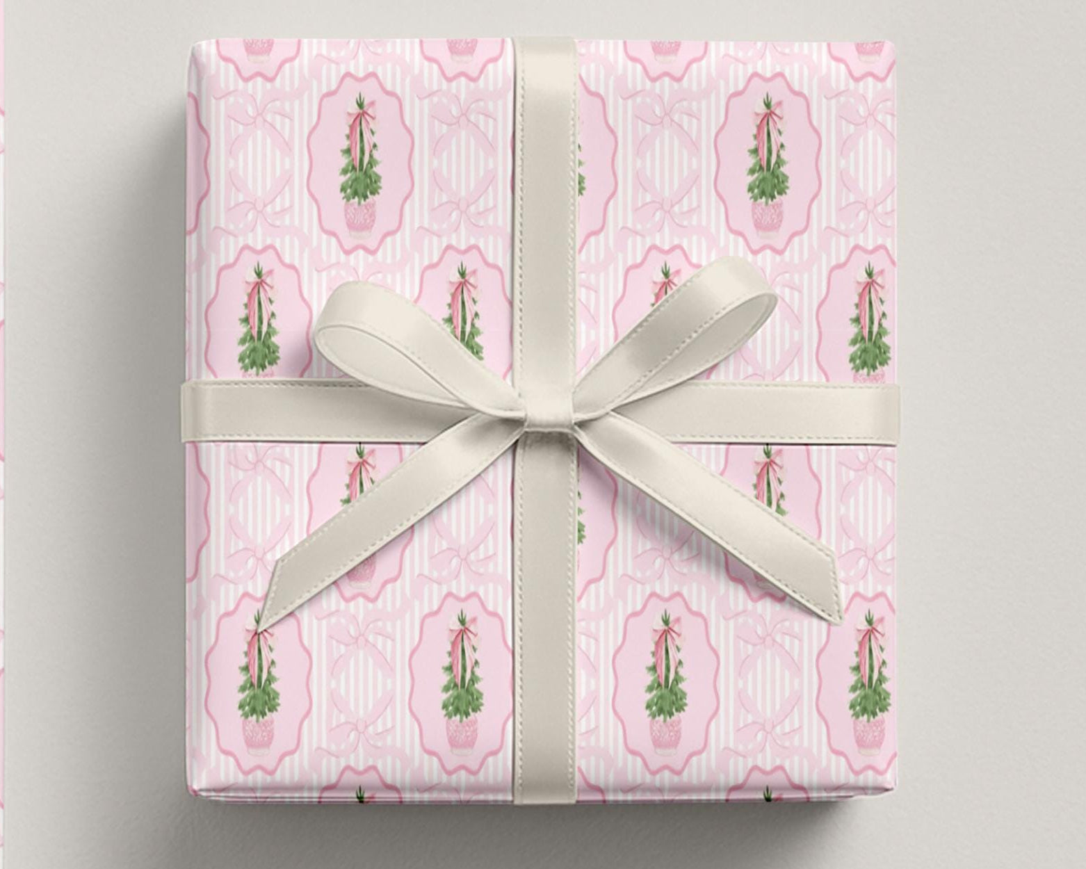 Add a touch of southern elegance to your holiday gifts with our Pink Topiary Christmas Wrapping Paper, featuring watercolor Christmas trees in chinoiserie-inspired planters tied with delicate pink bows.