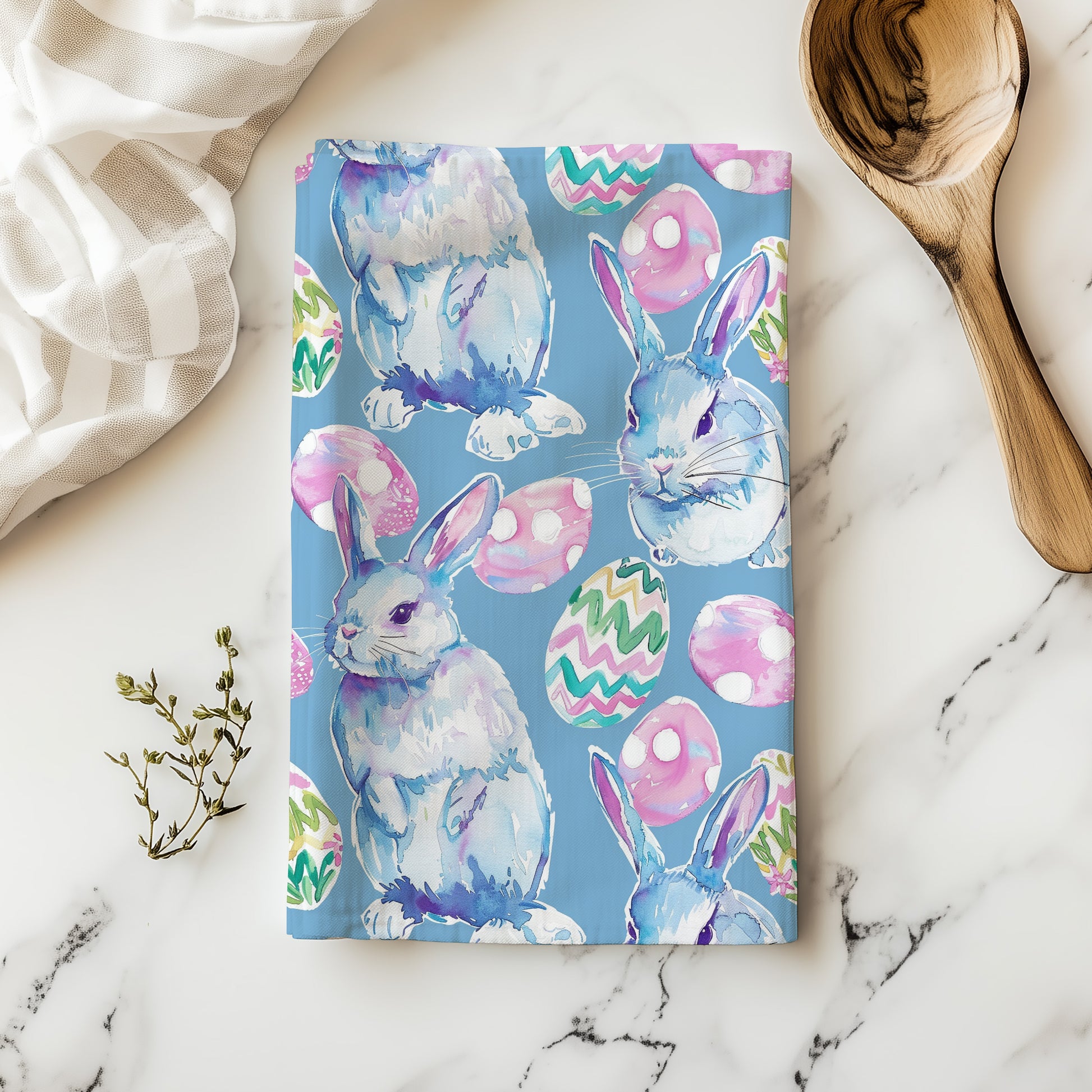 Make your kitchen feel instantly spring-ready with this bright, cheerful Easter bunny tea towel. The design features watercolor blue bunnies paired with colorful painted Easter eggs (polka dots, zigzags, and floral accents) on a vivid blue background. It’s playful, preppy, and perfect for Easter hosting or adding a pop of seasonal color.