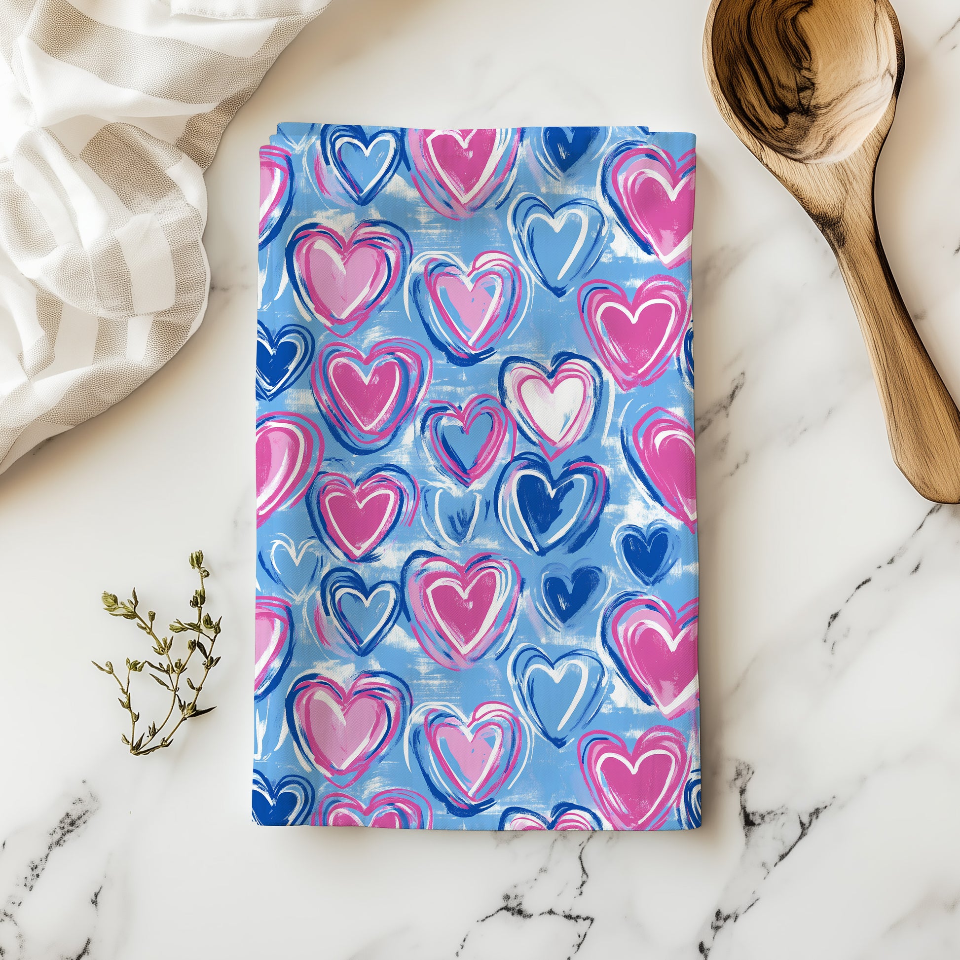 Brighten your kitchen with a bold, preppy Valentine look. This tea towel features hand-painted style hearts in pink, navy, and light blue on a layered, brushy blue background—giving major coastal-preppy / modern girly vibes. It’s perfect for anyone who loves color, cute seasonal décor, and a more artistic take on Valentine’s Day.