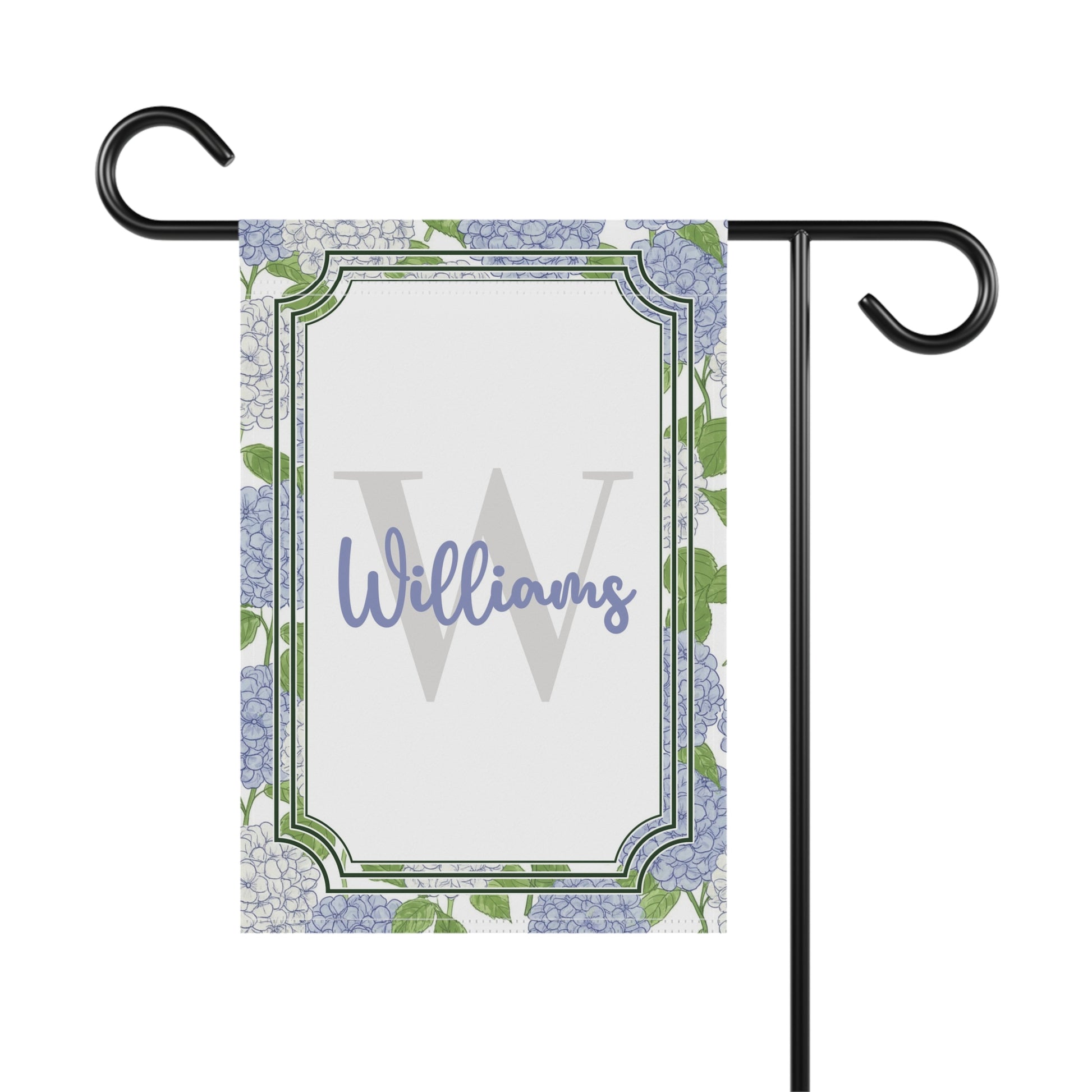 A charming garden and home banner that adds a touch of gentle elegance to porches, entryways, and flower beds. Soft hydrangea blooms frame a classic double-border with a subtle monogram in the center — a quiet, welcoming accent that reads like a handwritten name from the path. Lightweight yet durable, the double-sided print keeps the design visible from either direction while the top sleeve slips onto standard garden flag poles for easy display. The muted blues and greens create a calm, cottage-garden mood that pairs naturally with potted plants, wicker furniture, and morning light.