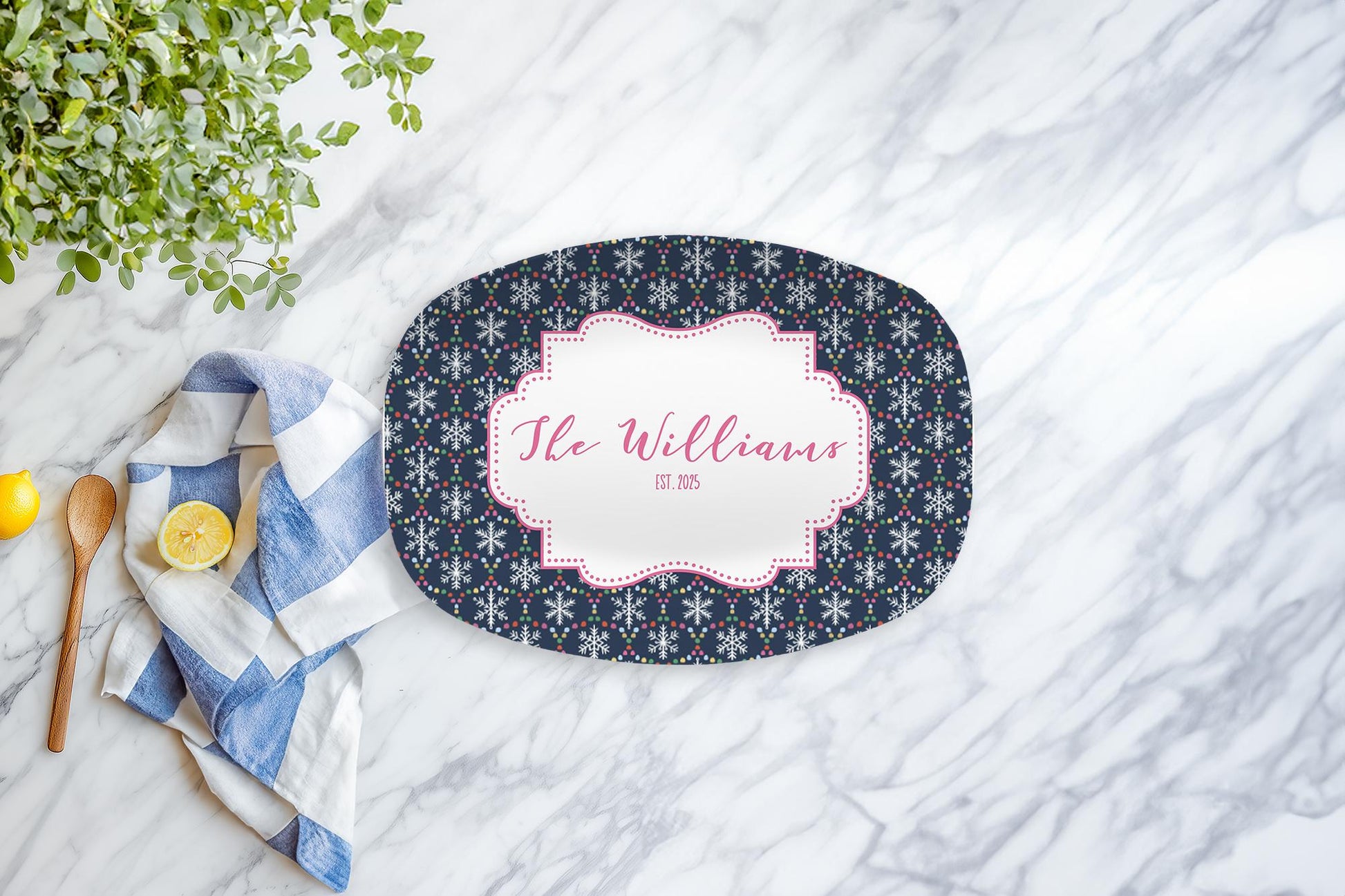 Add festive flair to your winter celebrations with our Navy Snowflake Personalized Platter. A fun twist on holiday decor, this design features crisp white snowflakes and colorful dot garlands over a navy backdrop. Personalized with your family name, it’s both joyful and functional.