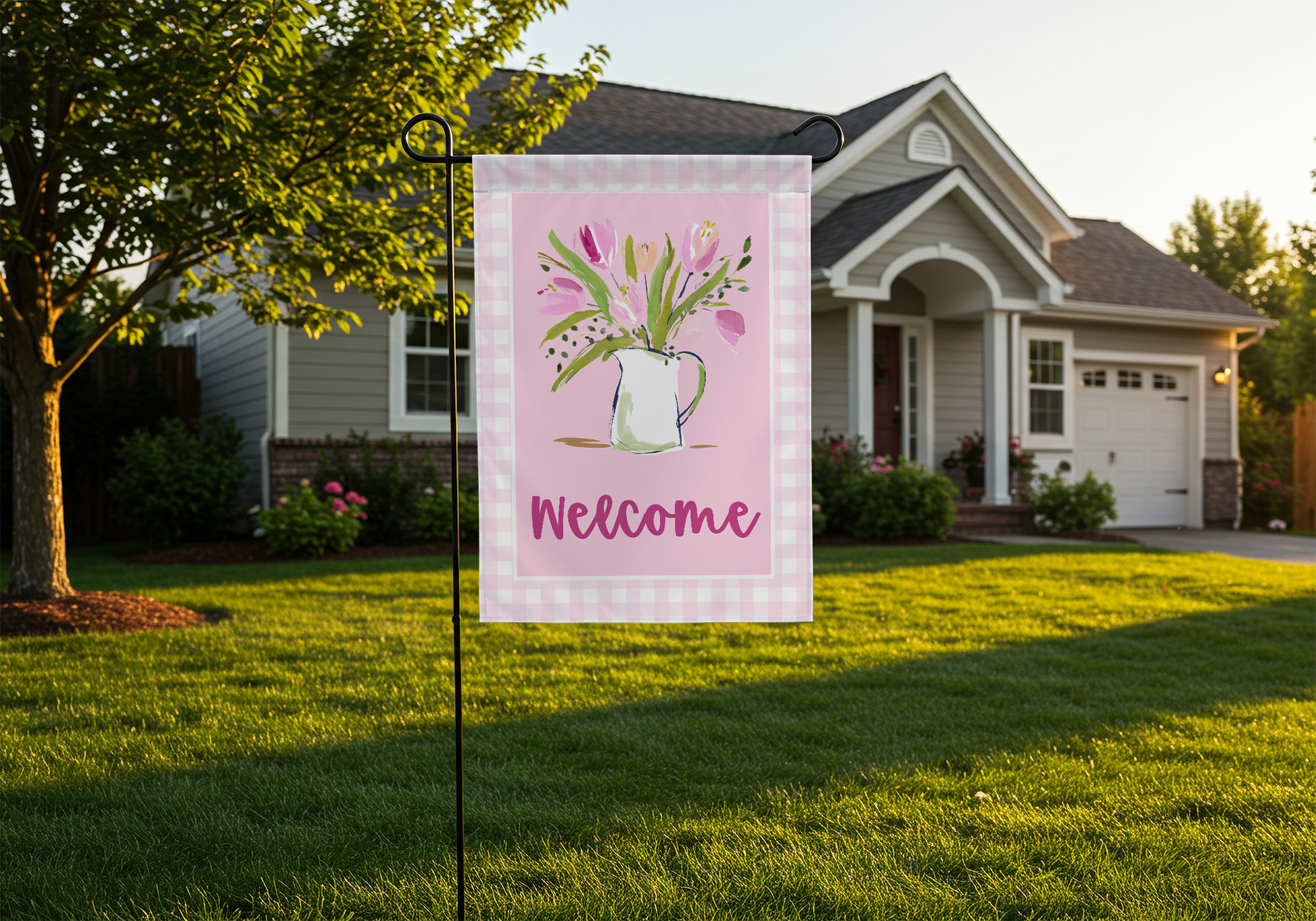 This charming garden flag features loose watercolor pink tulips and greenery arranged in a white pitcher, set against a soft pink background and framed with a classic pink gingham border. Finished with a friendly “Welcome,” it’s perfect for brightening your porch or garden.