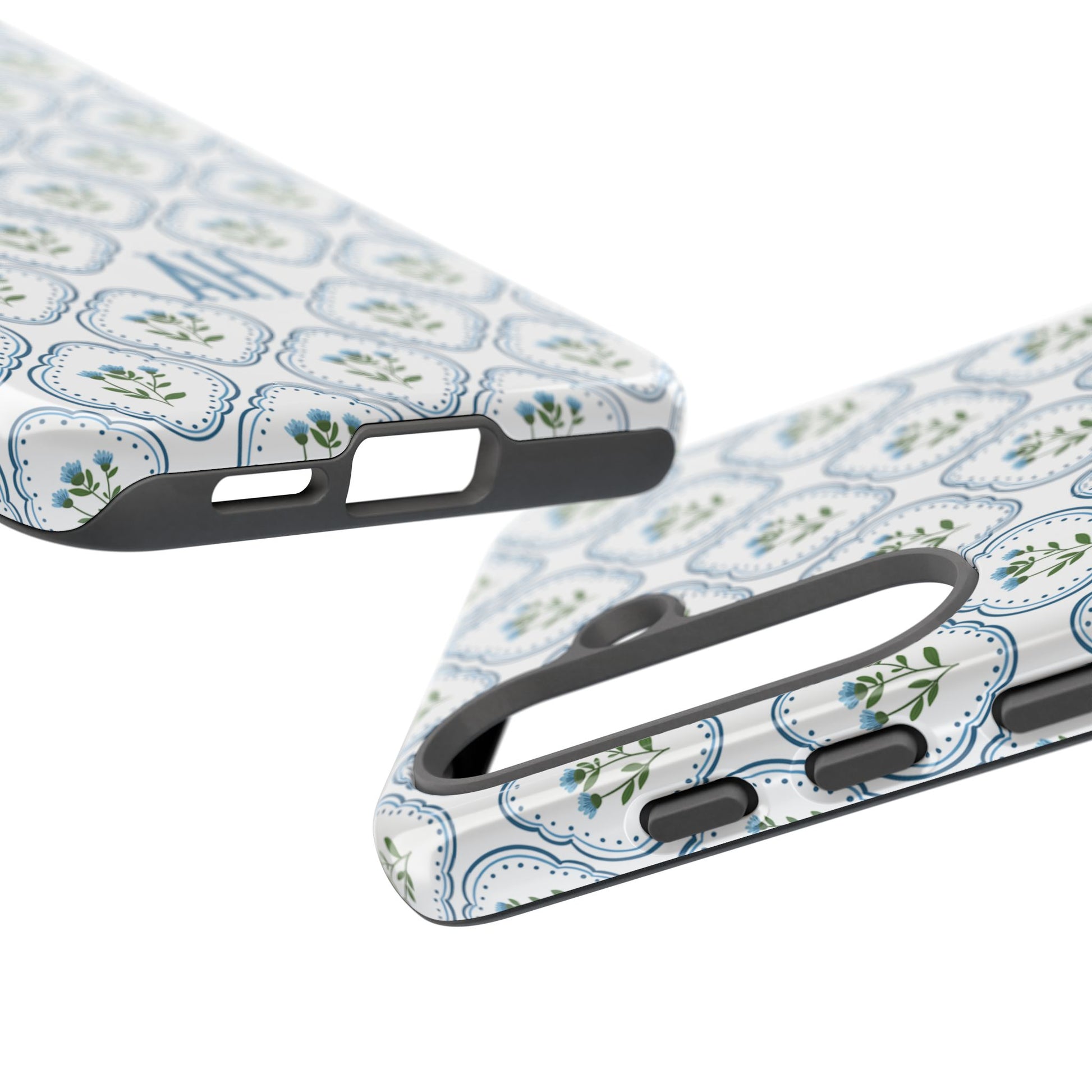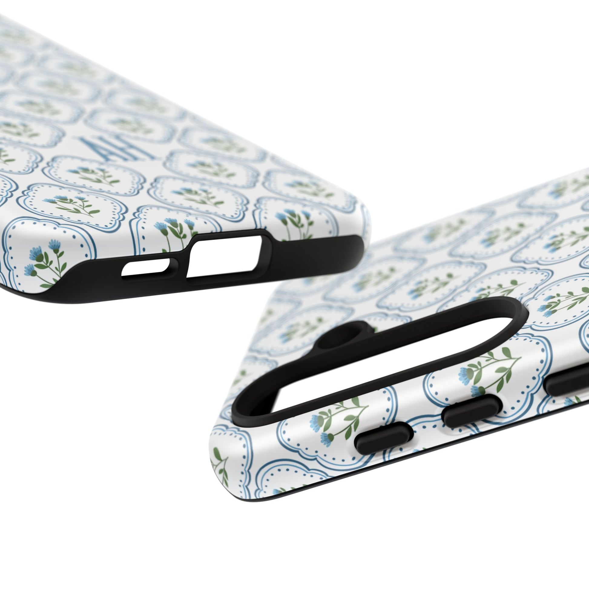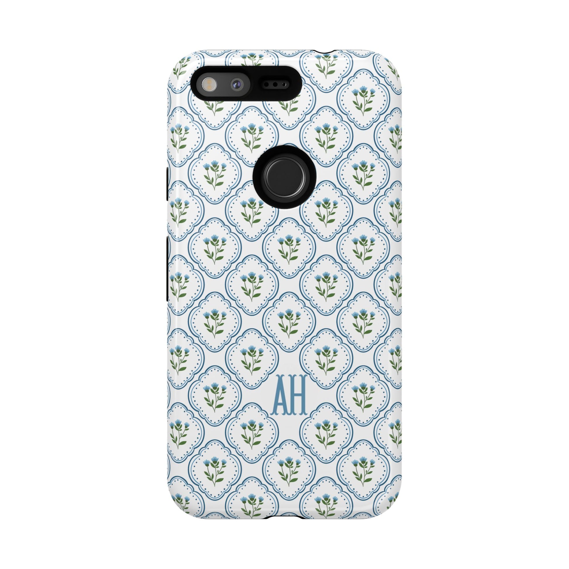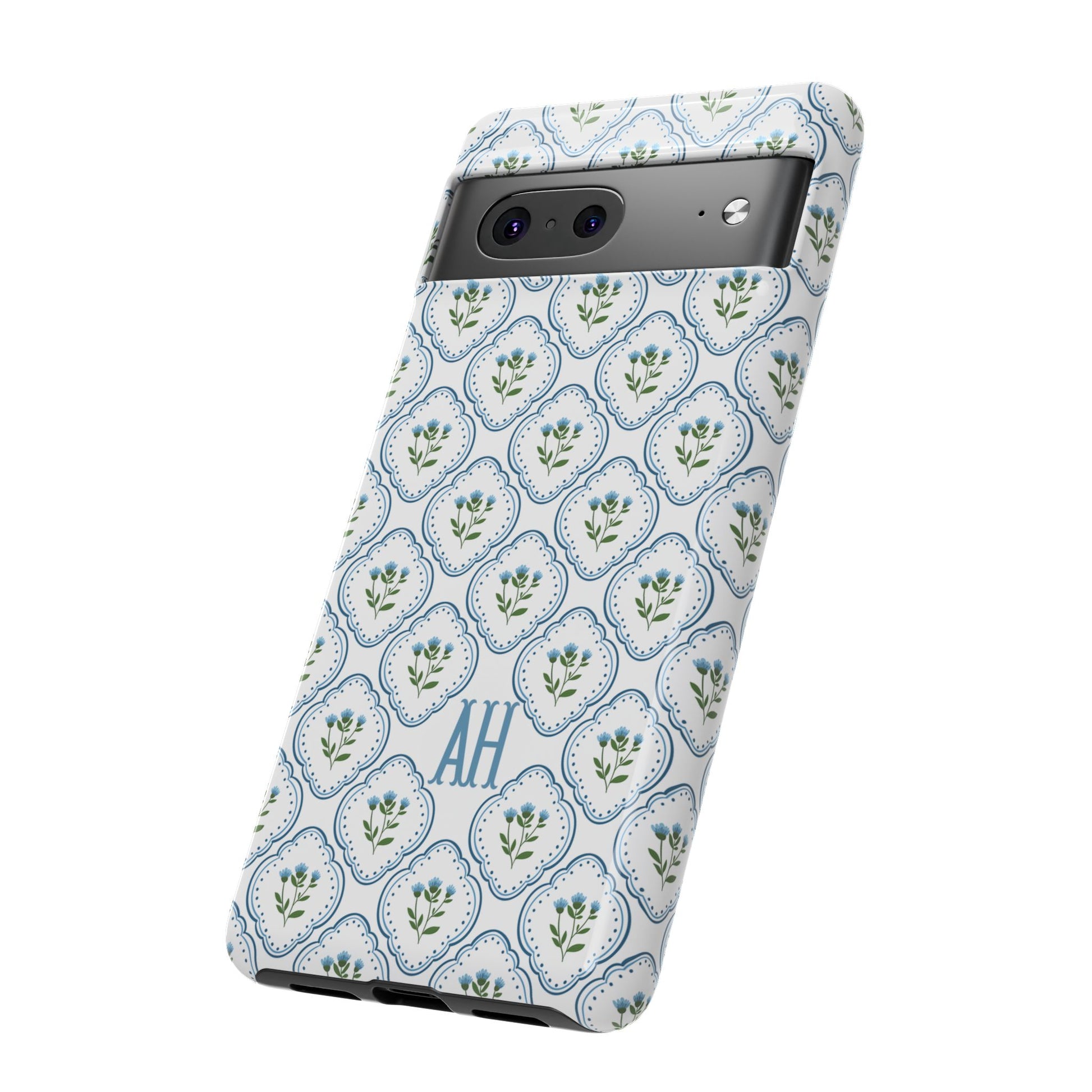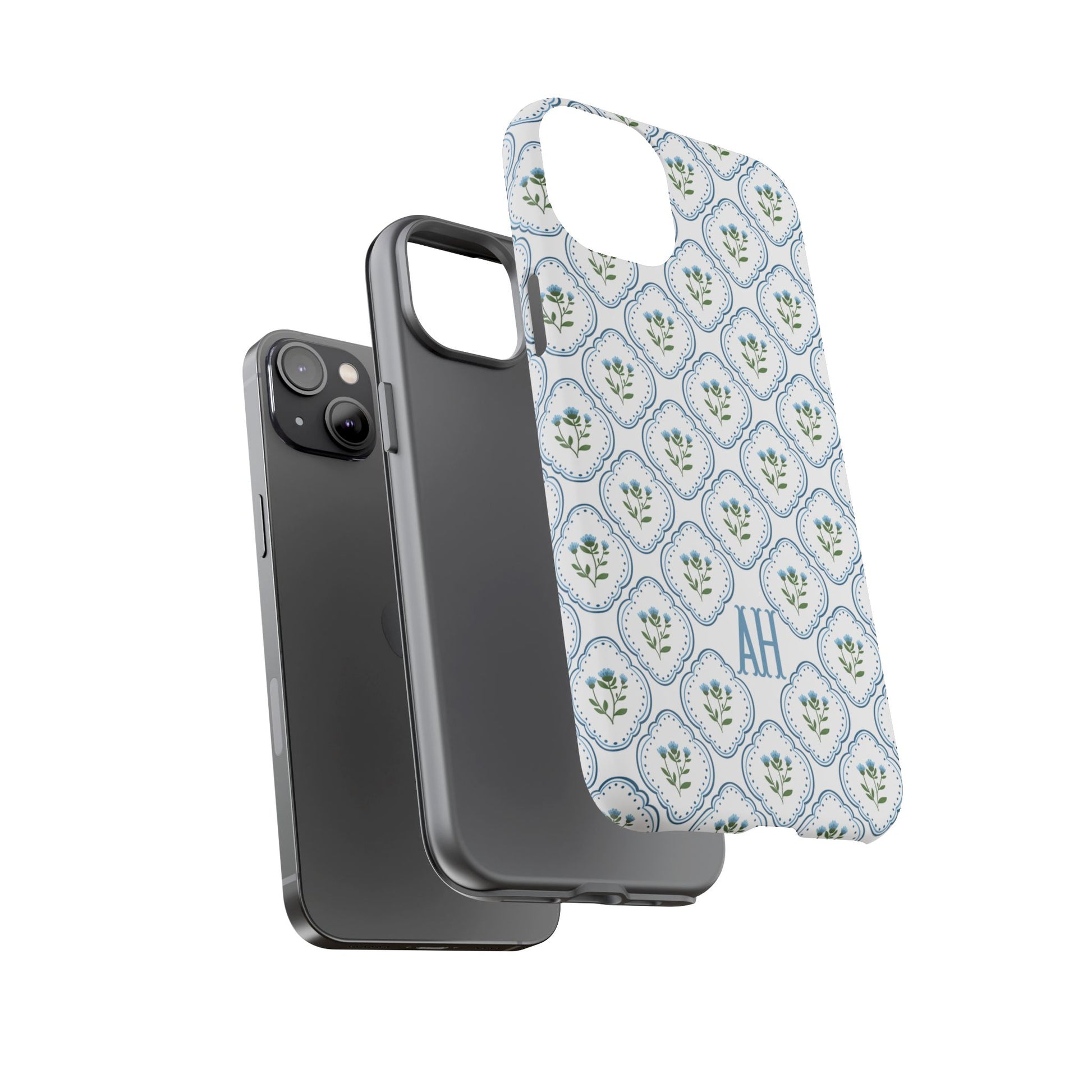 Your new everyday favorite: a soft, cottage-preppy Monogram phone case featuring delicate blue florals in a classic scalloped tile pattern, finished with your custom initial. It’s a Trendy iPhone case that still feels timeless—clean, pretty, and totally giftable.