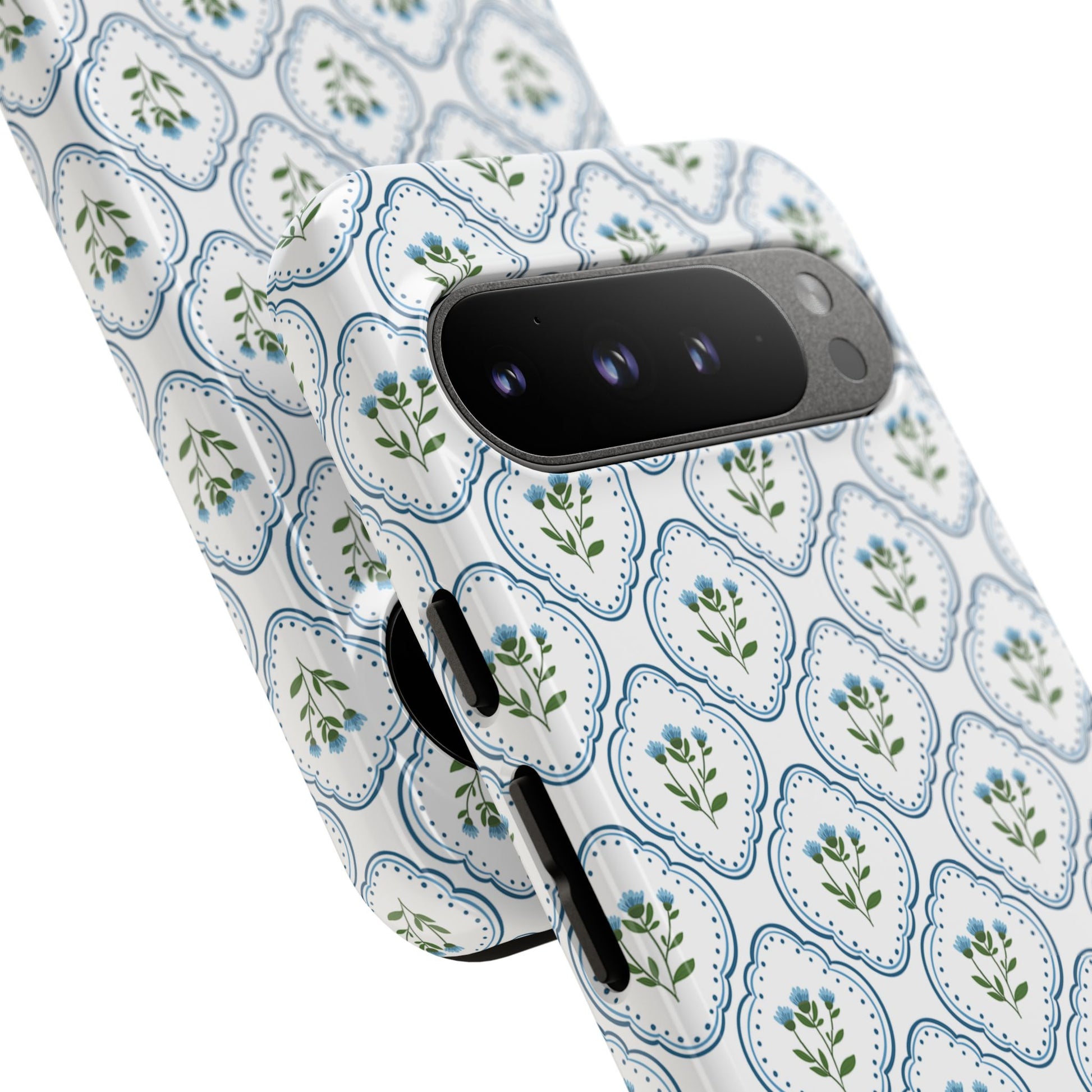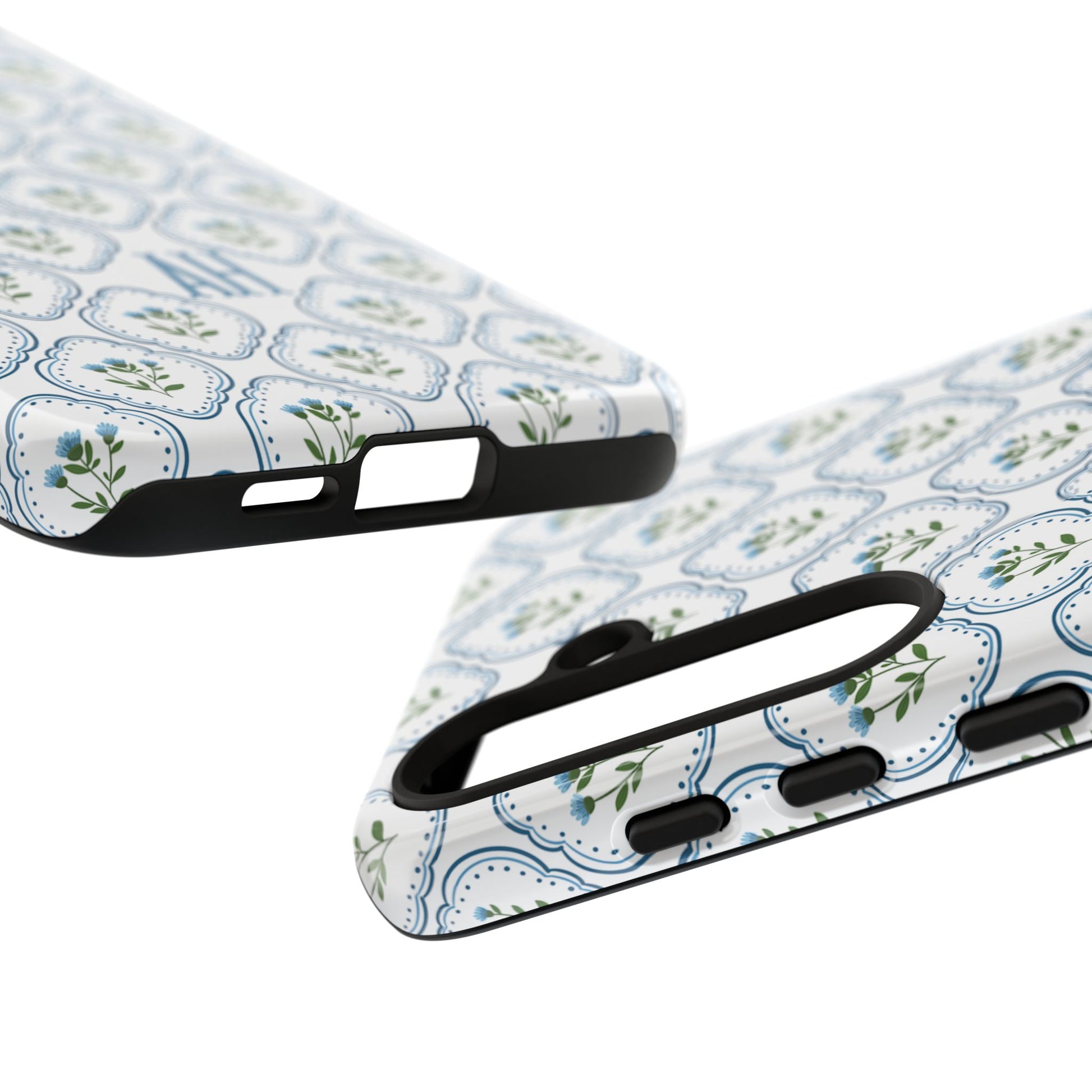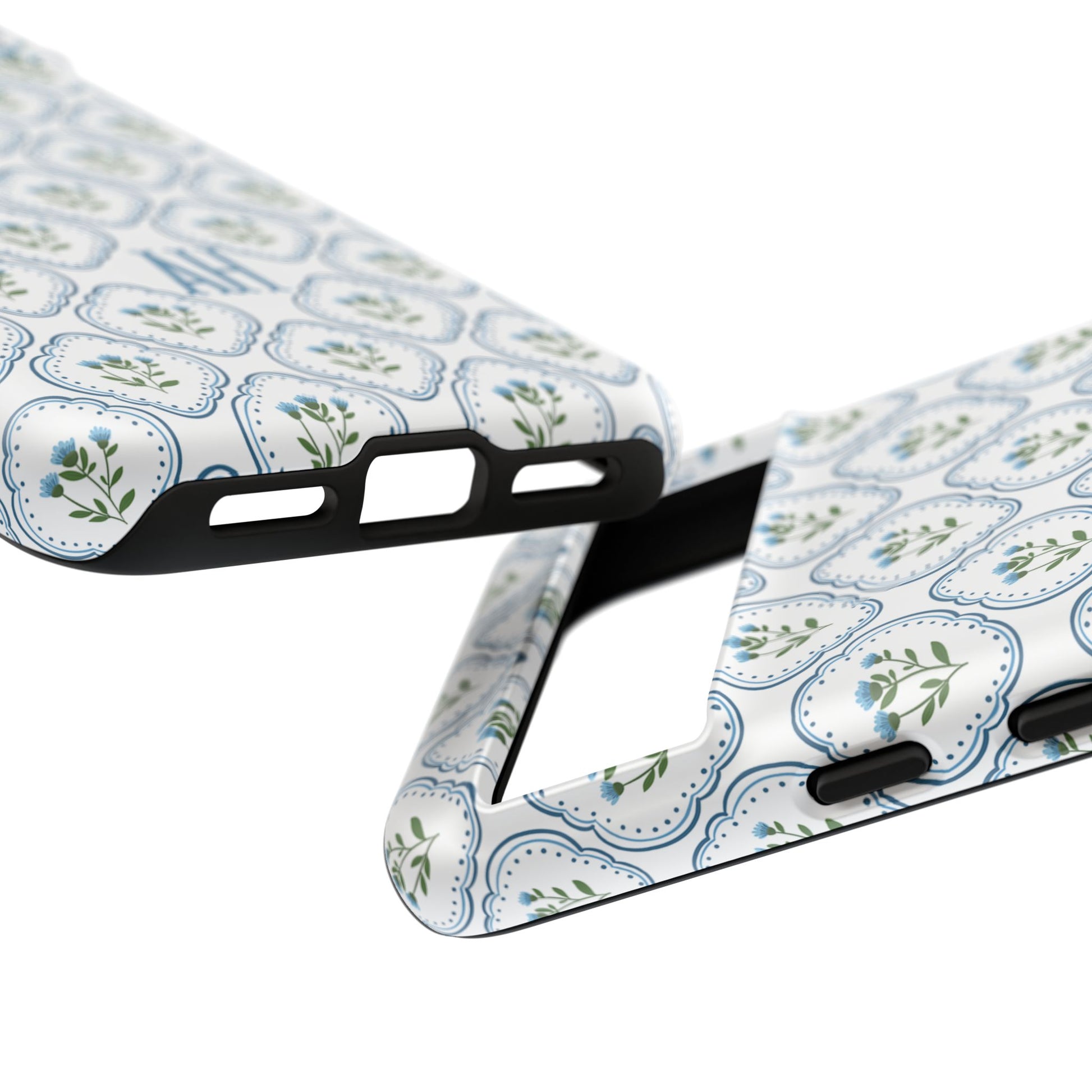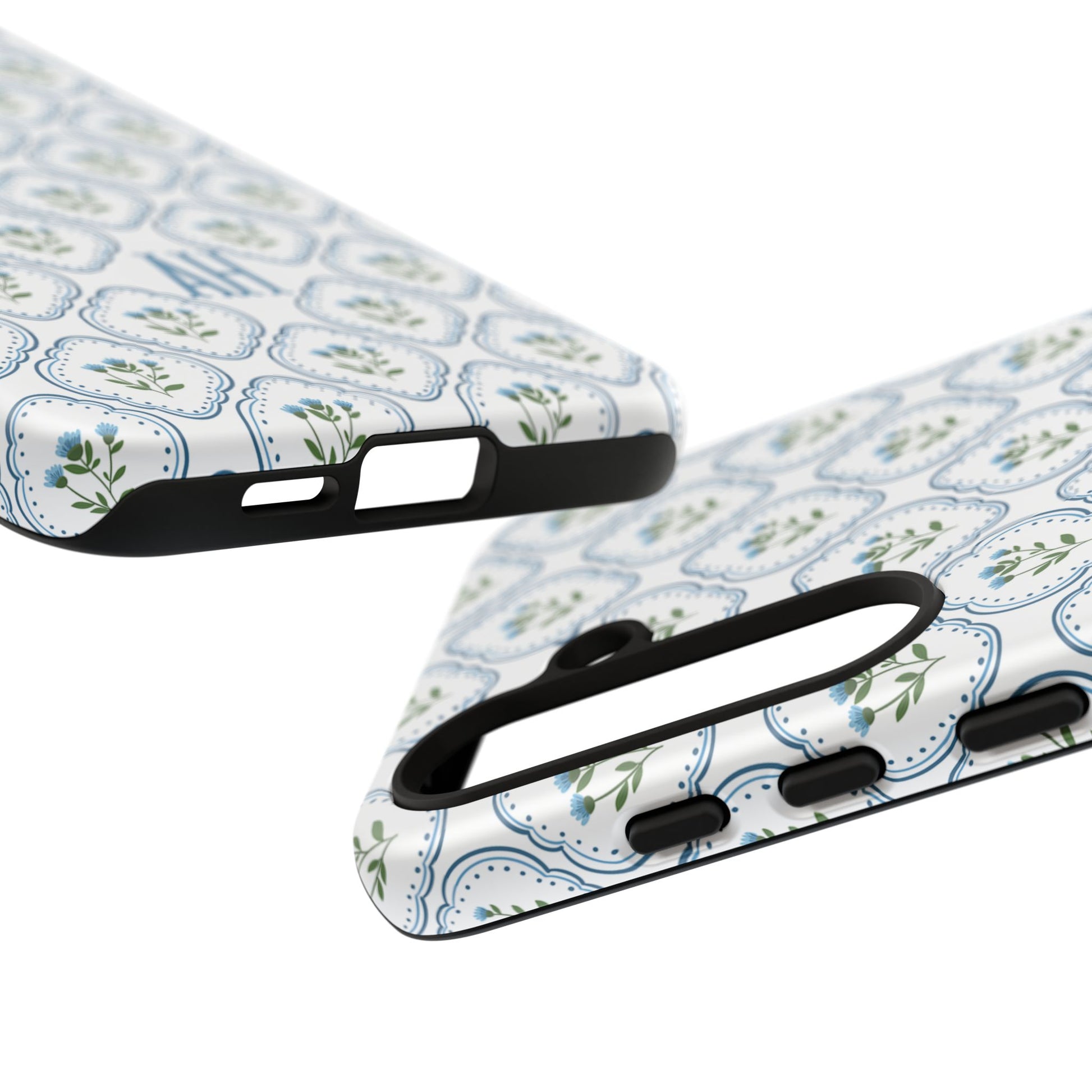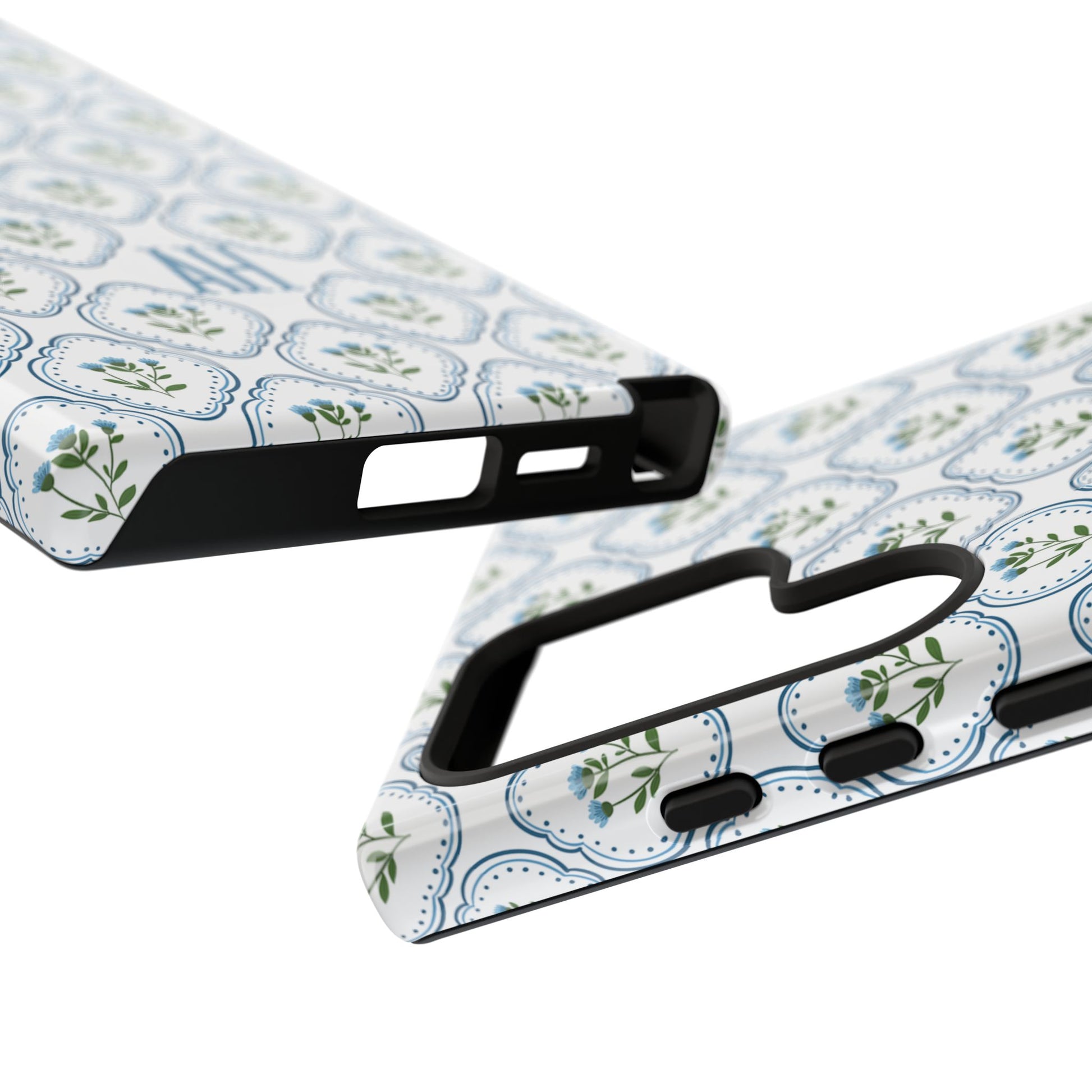 Your new everyday favorite: a soft, cottage-preppy Monogram phone case featuring delicate blue florals in a classic scalloped tile pattern, finished with your custom initial. It’s a Trendy iPhone case that still feels timeless—clean, pretty, and totally giftable.