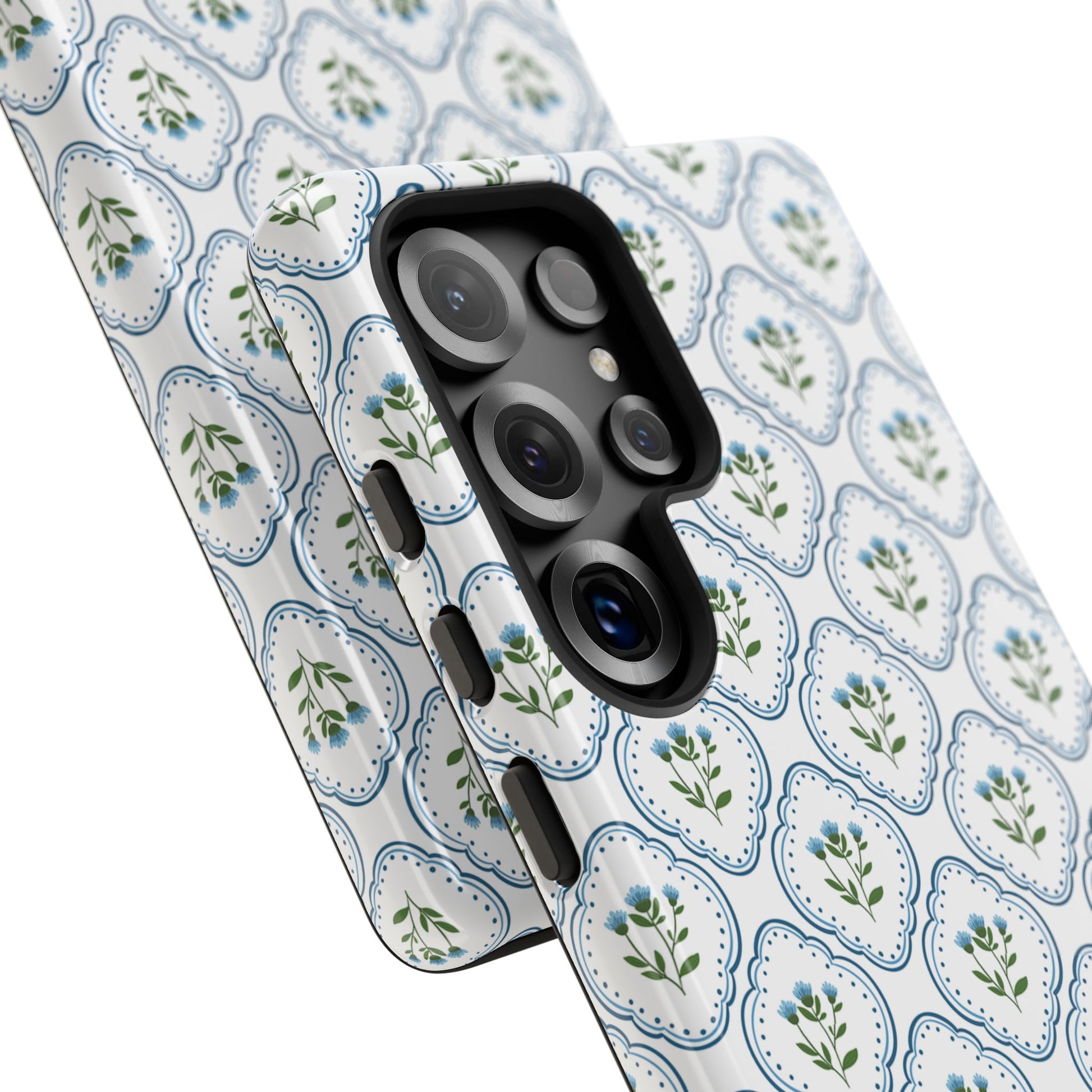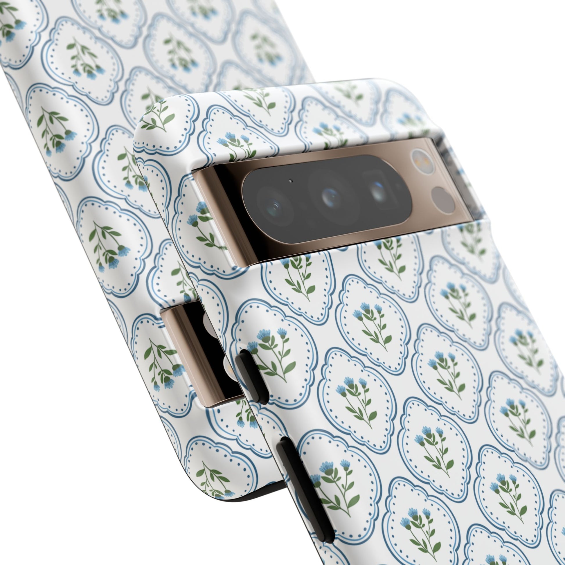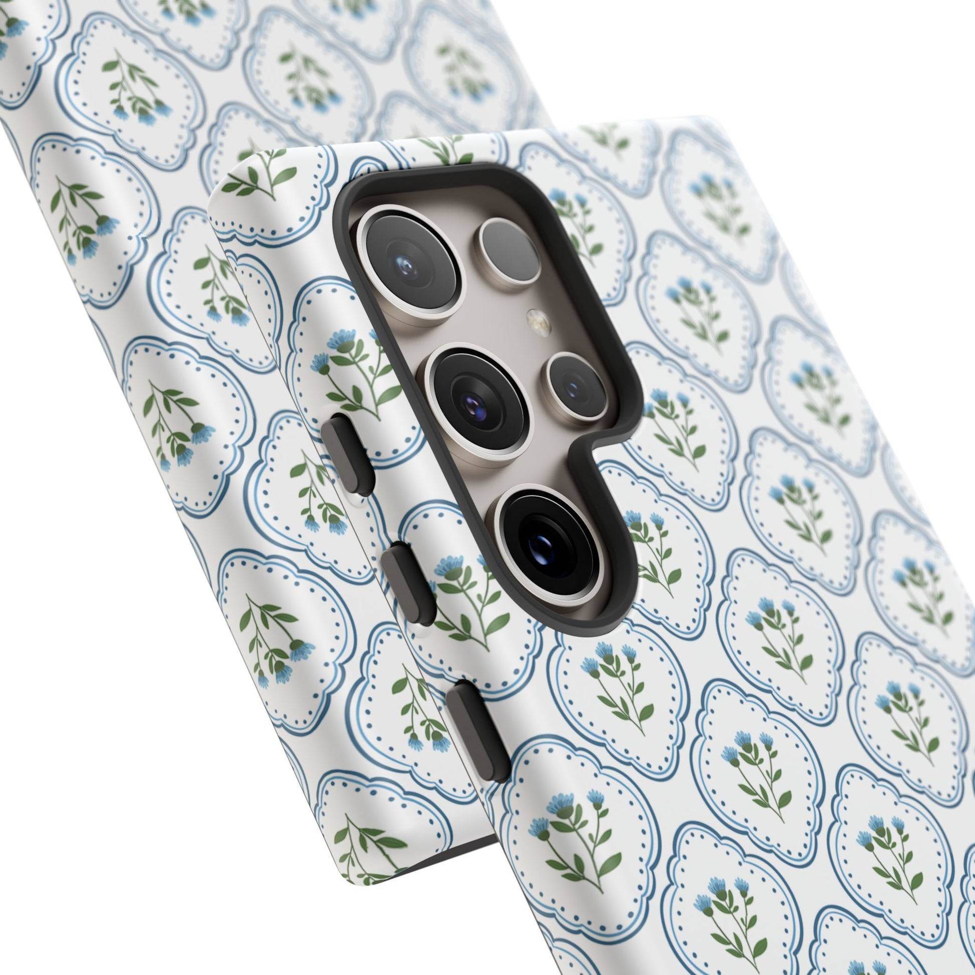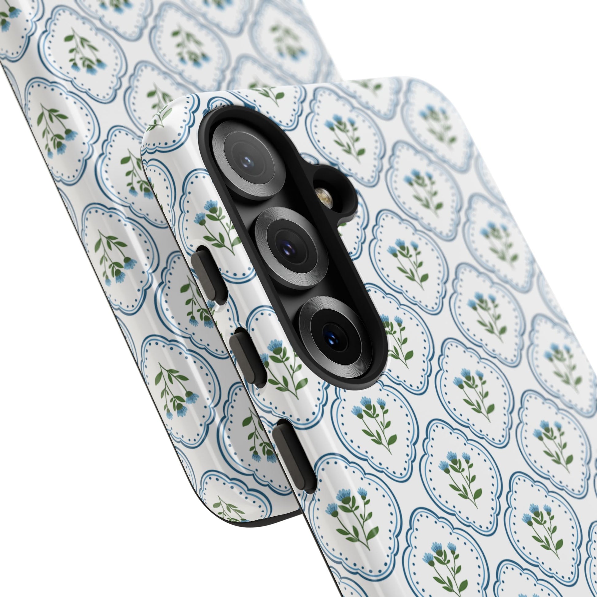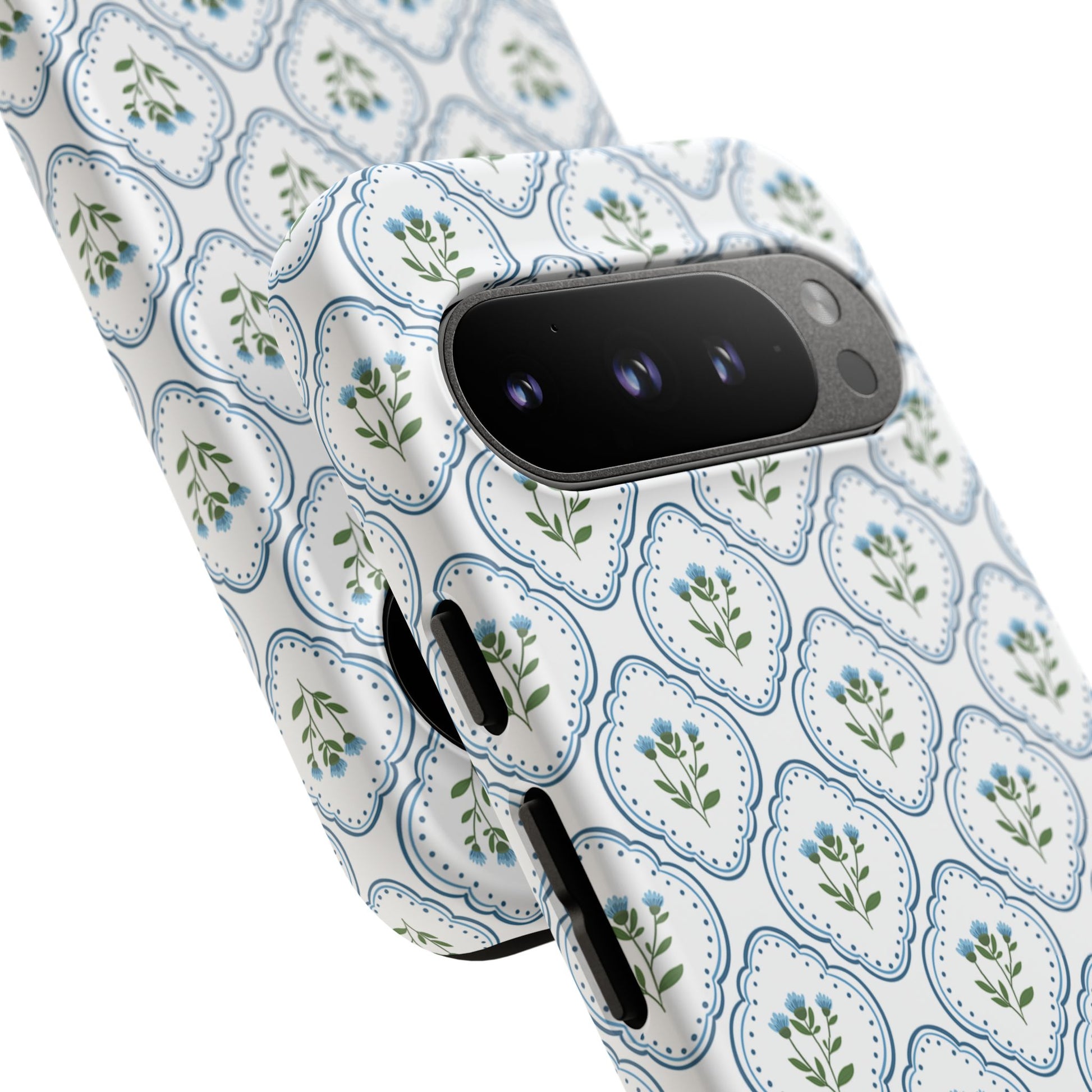 Your new everyday favorite: a soft, cottage-preppy Monogram phone case featuring delicate blue florals in a classic scalloped tile pattern, finished with your custom initial. It’s a Trendy iPhone case that still feels timeless—clean, pretty, and totally giftable.