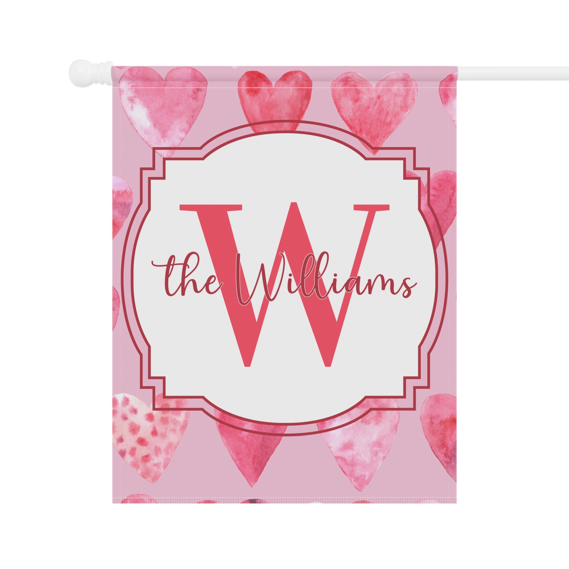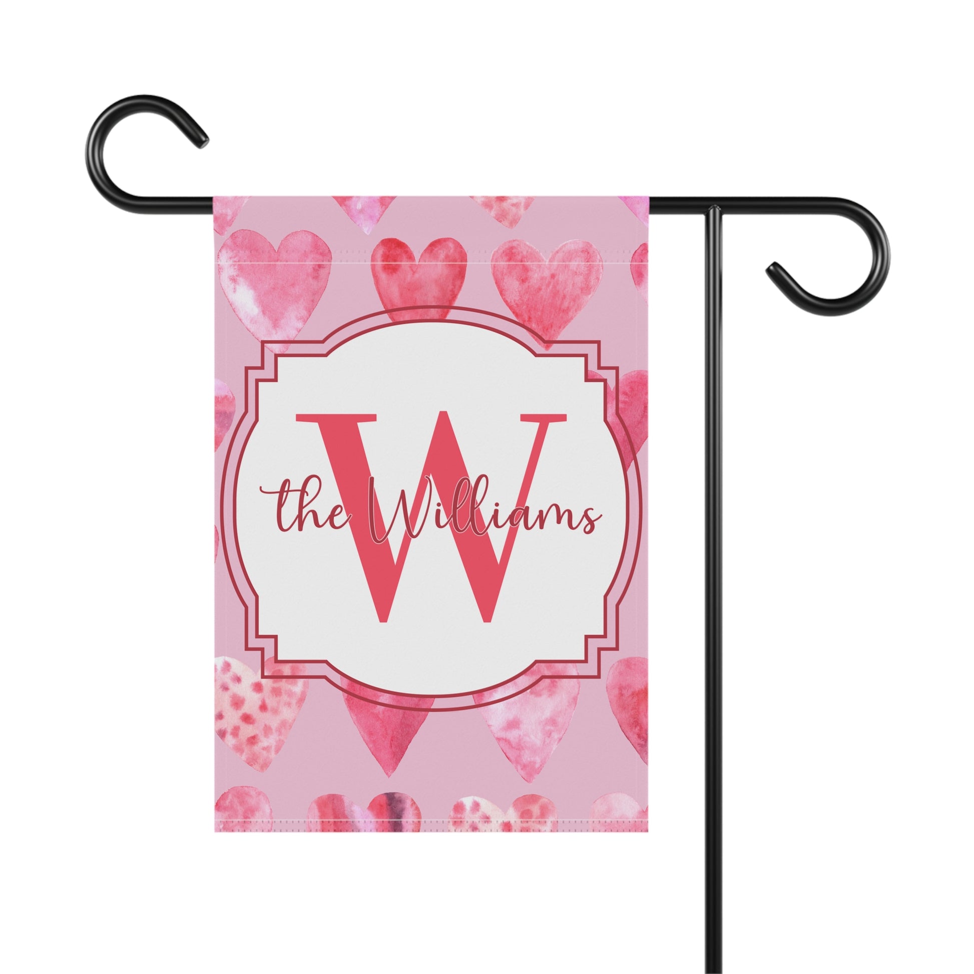 Set on a background of charming watercolor hearts, this flag features your family initial in bold red, paired with your last name in script across the center. A perfect way to add a romantic and personal touch to your yard, porch, or garden this season!