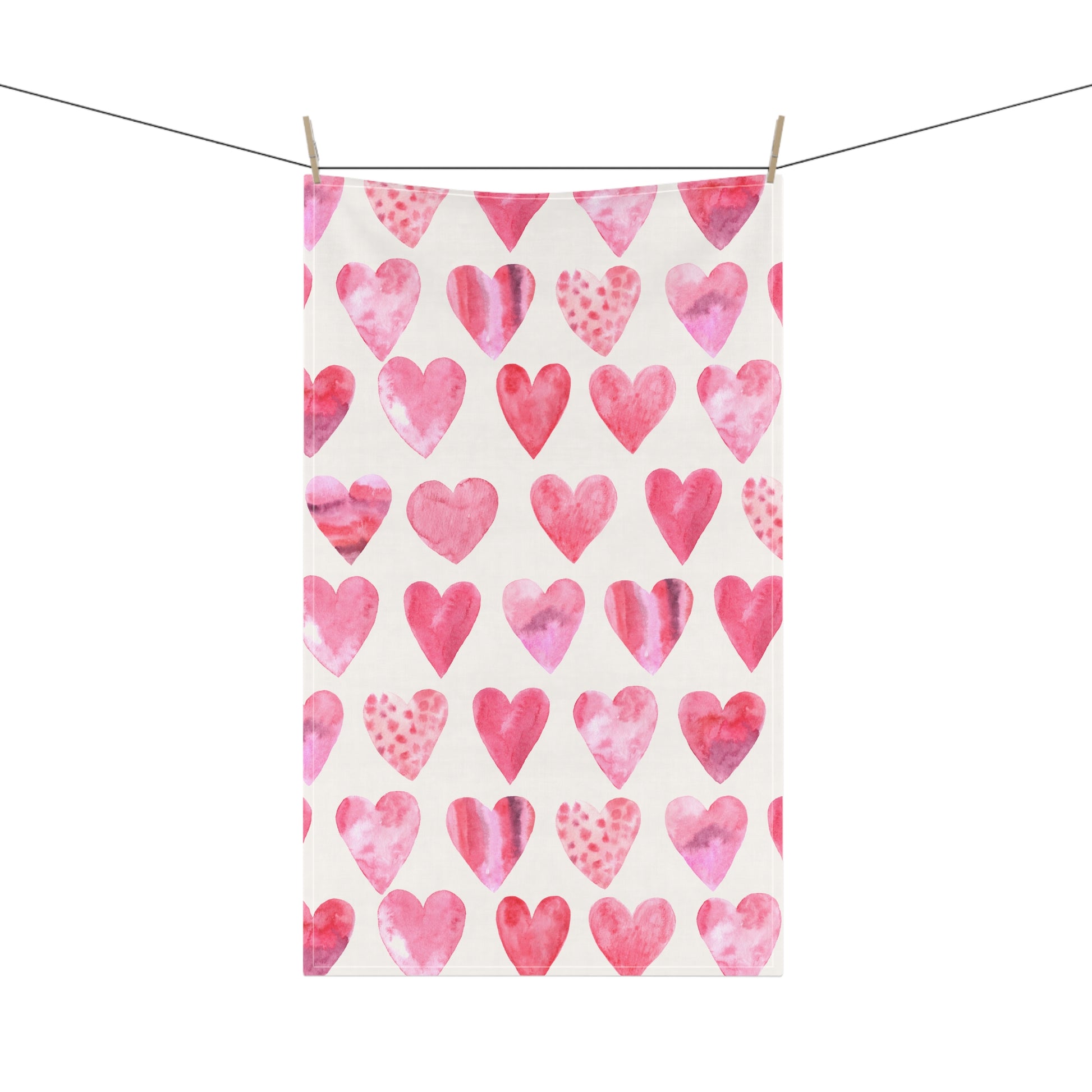 A soft, charming kitchen towel patterned with rows of hand-painted watercolor hearts in shades of pink and rose. Lightweight and hemmed for durability, it brings a warm, homemade touch to everyday tasks — from drying dishes to lining a bread basket. Choose breathable cotton twill for absorbency or polyester for vivid, long-lasting color and stretch. The one-sided print keeps the design bright where it shows, while the neutral off-white background lets the hearts pop without overwhelming your counter. It hangs easily, folds neatly, and adds a gentle, romantic accent to morning coffee runs, cozy brunches, or seasonal decor swaps. Valentines Heart Tea Towel