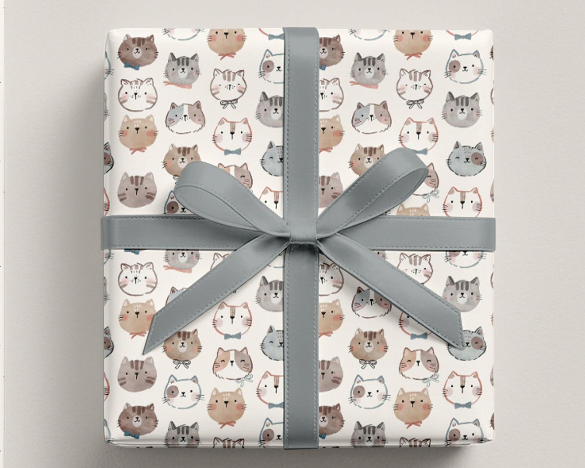 Soft, watercolor friends drape across creamy 90gsm fine art paper to turn ordinary gifts into cozy moments. Each roll features hand-painted cats in warm neutrals and blush tones, spaced with gentle breathing room so bows and tags sit neatly on the pattern. Choose glossy for a subtle sheen that makes the tiny details pop, or matte for a velvety, stationery-like feel. The long-format sizes let you wrap tall bottles, multiple boxes, or several smaller presents without visible seams. When you wrap with this paper, it reads like a handwritten note—quiet, thoughtful, and made to make someone smile on holidays, birthdays, or small celebrations at home.