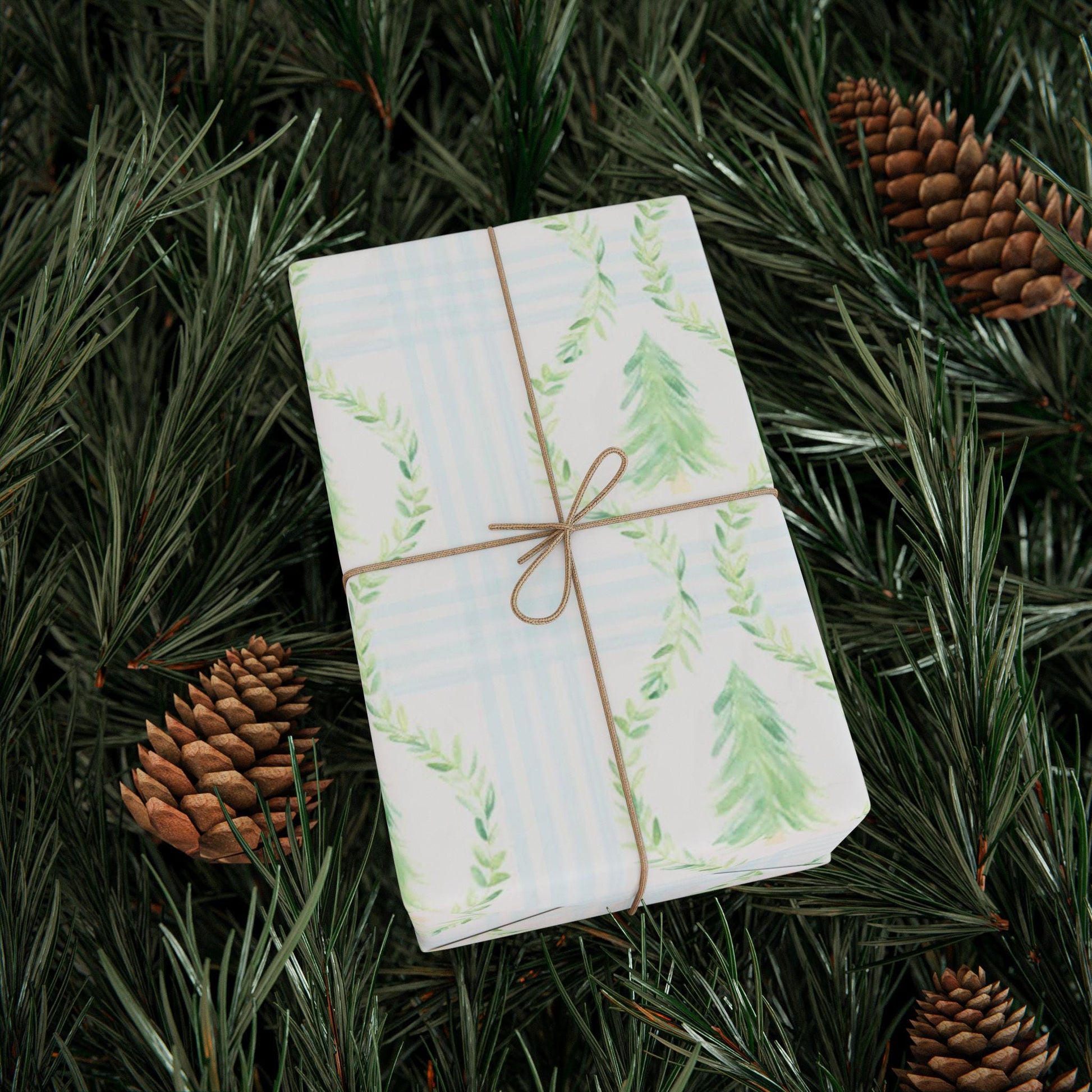 Featuring hand-painted evergreen trees framed by soft laurel wreaths on a pale plaid background, this paper captures the cozy sophistication of a Southern Christmas aesthetic. Ideal for anyone who loves timeless, neutral-toned décor with a hint of vintage holiday magic.
