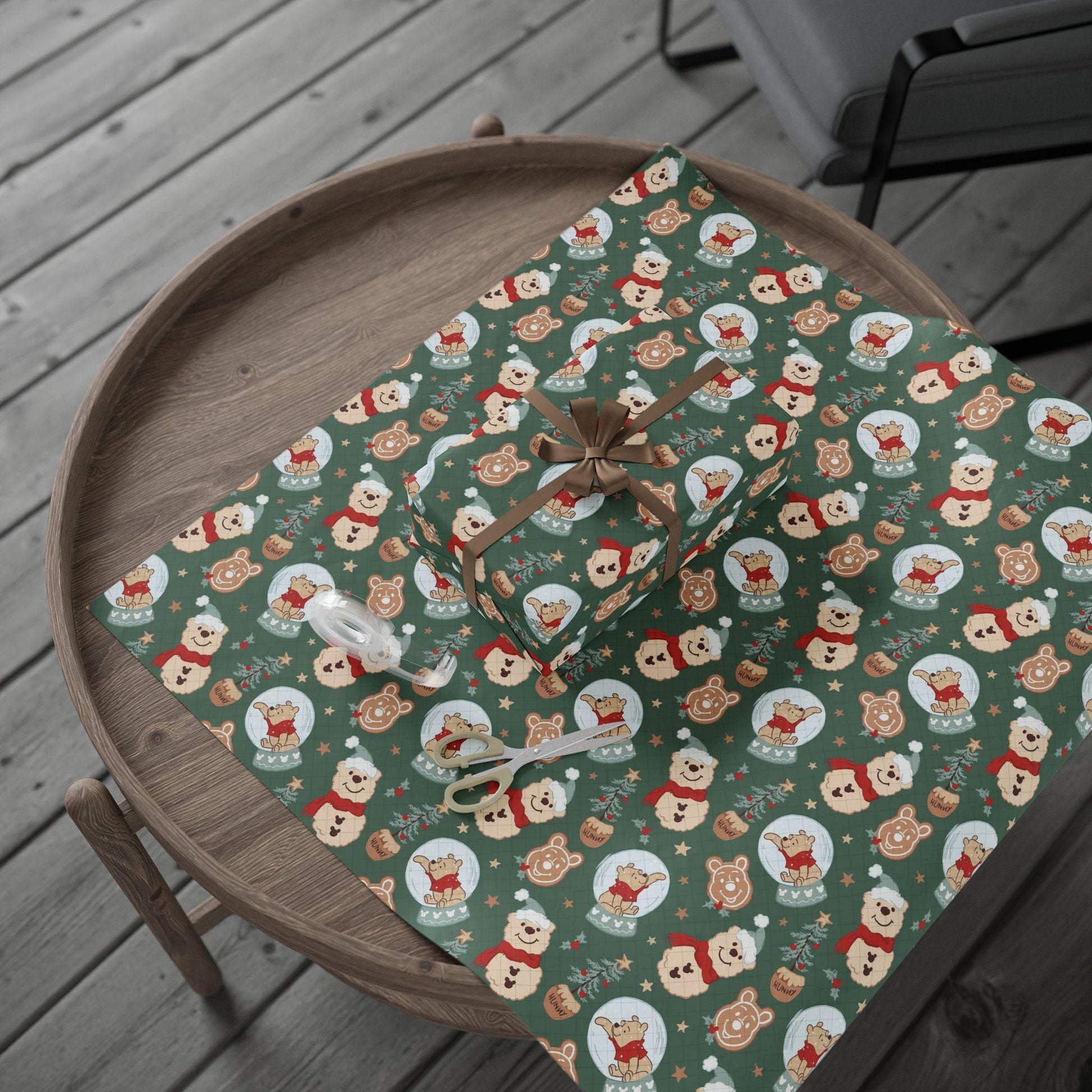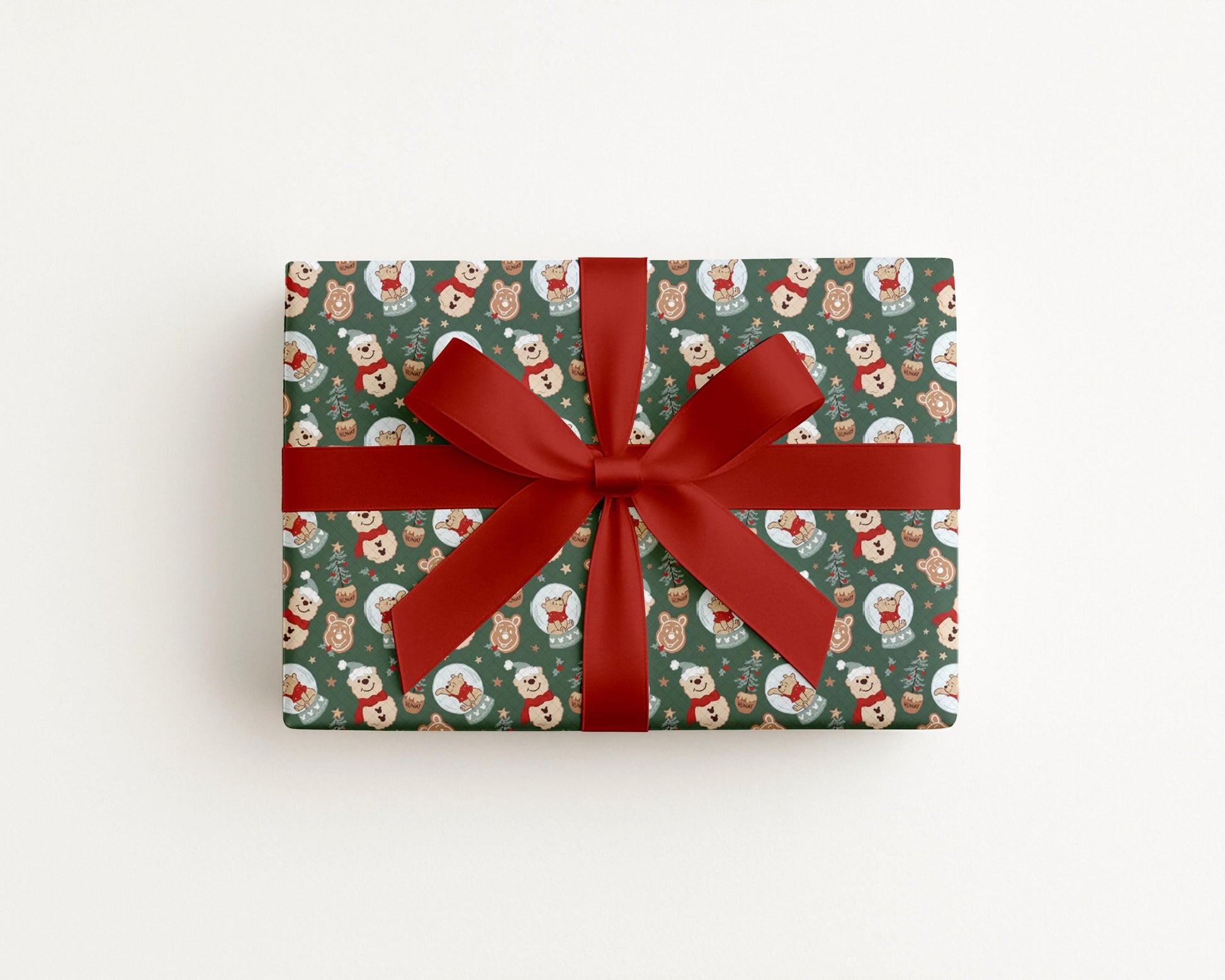 Wrap your gifts in sweet, storybook charm with this Winnie the Pooh-inspired Christmas wrapping paper! Featuring adorable hand-drawn snow globes with Pooh Bear, honey pots, Christmas trees, and gingerbread-style bear cookies—all set on a festive forest green background. It’s a heartwarming and whimsical choice for fans of classic characters and cozy holiday vibes.