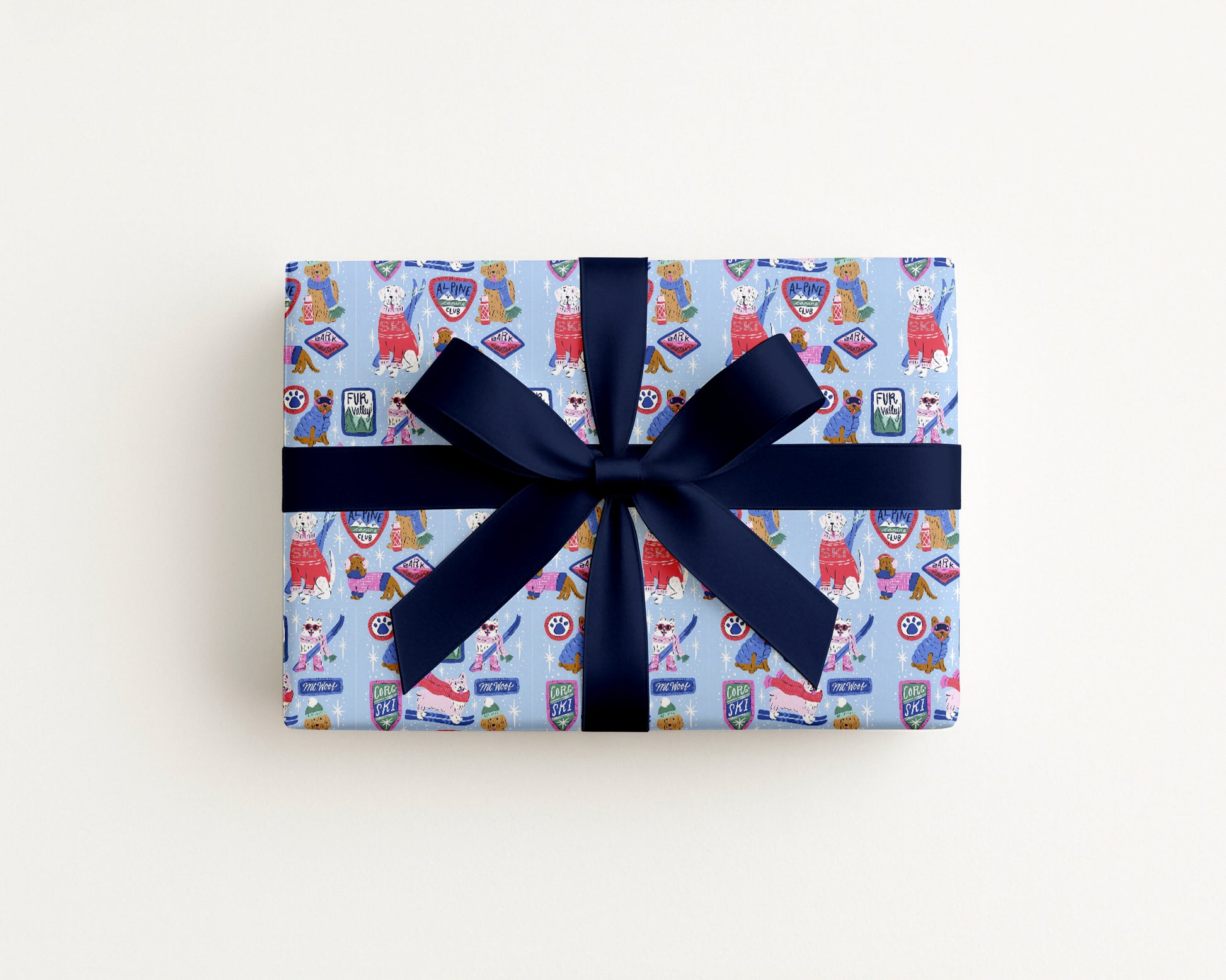 Set against a frosty blue backdrop with playful alpine-themed icons, this wrapping paper is perfect for dog lovers, holiday gifting, winter birthdays, or adding a quirky, festive touch to your packaging.