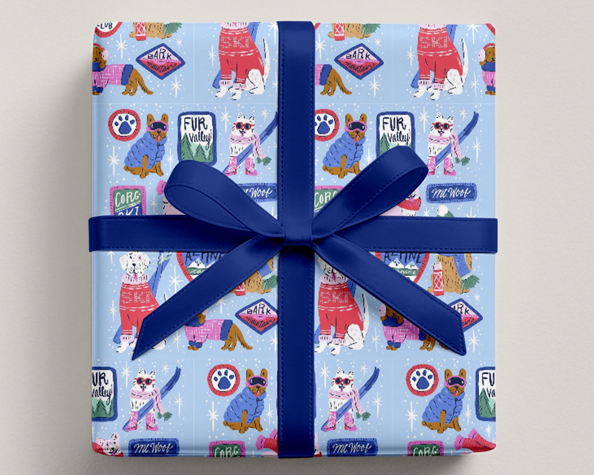 Hit the slopes with your furry friends! This charming winter dog gift wrap features stylish pups all dressed up in cozy ski sweaters, scarves, and beanies, ready for a snow day at the lodge.