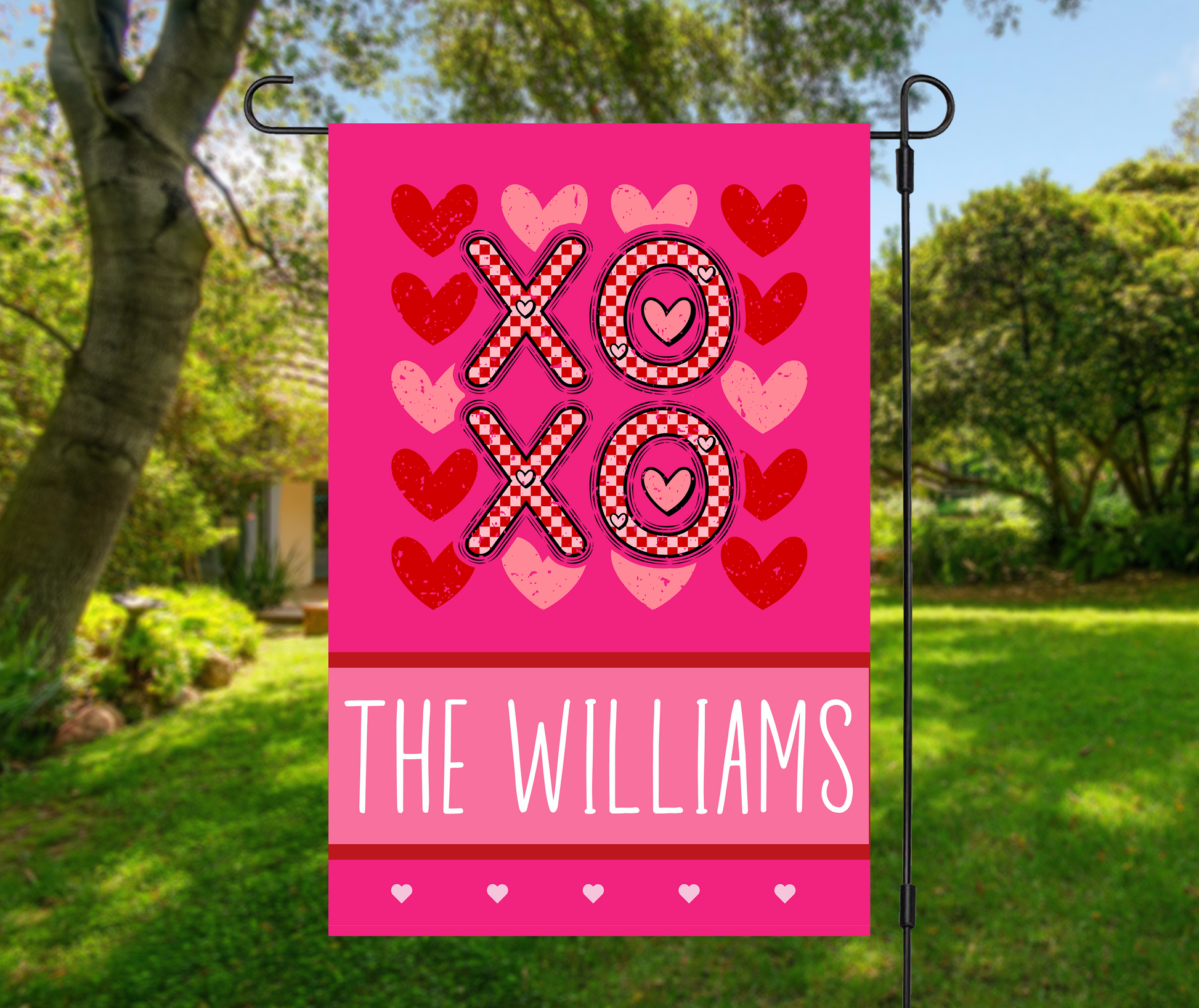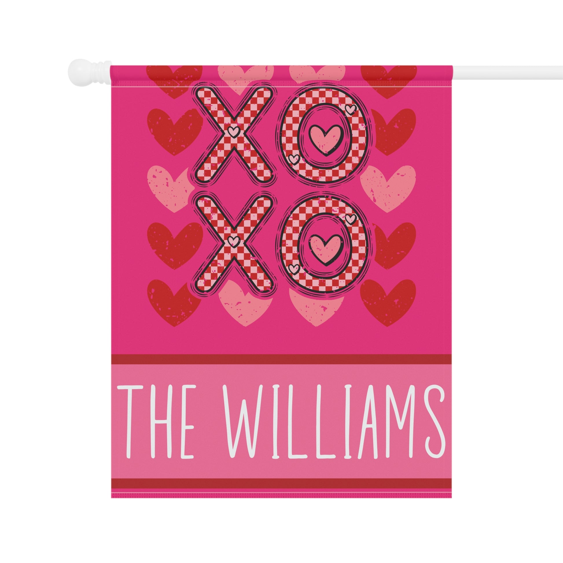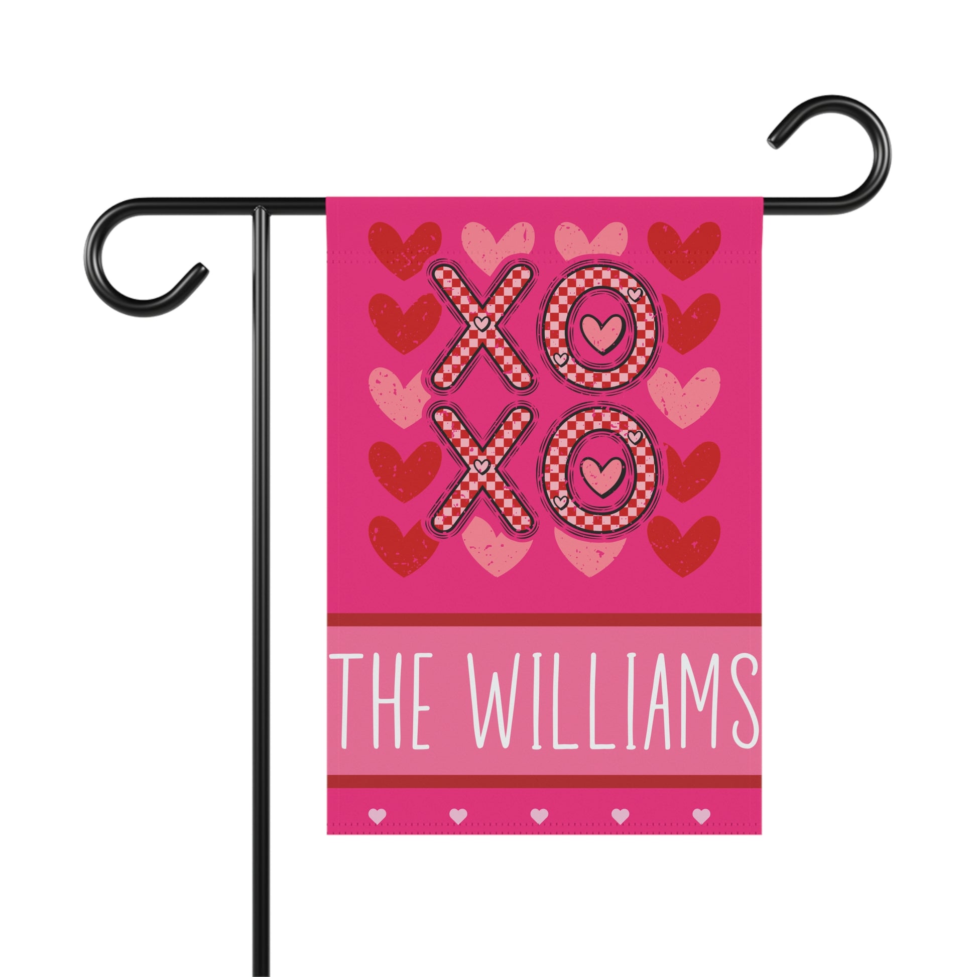 Send some sweet hugs and kisses straight from your yard with this vibrant XOXO Valentine garden flag! Featuring bold patterned letters, heart accents, and a custom family name, it's a fun way to dress up your porch, lawn, or garden for the season of love. 💖